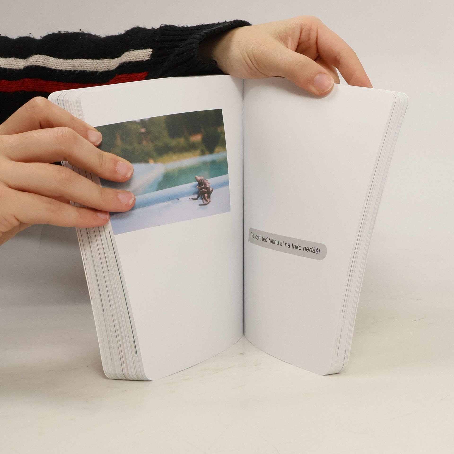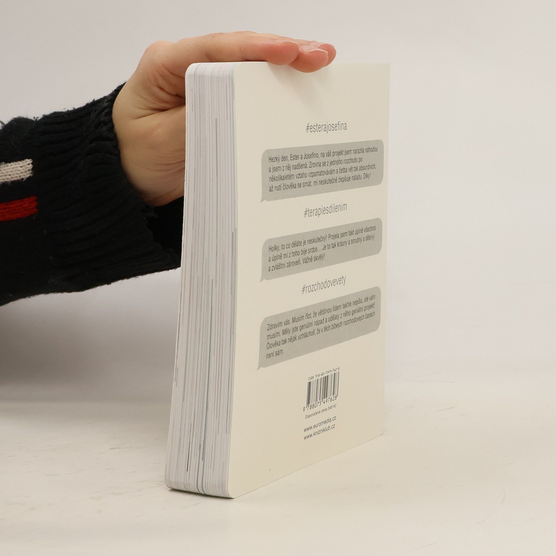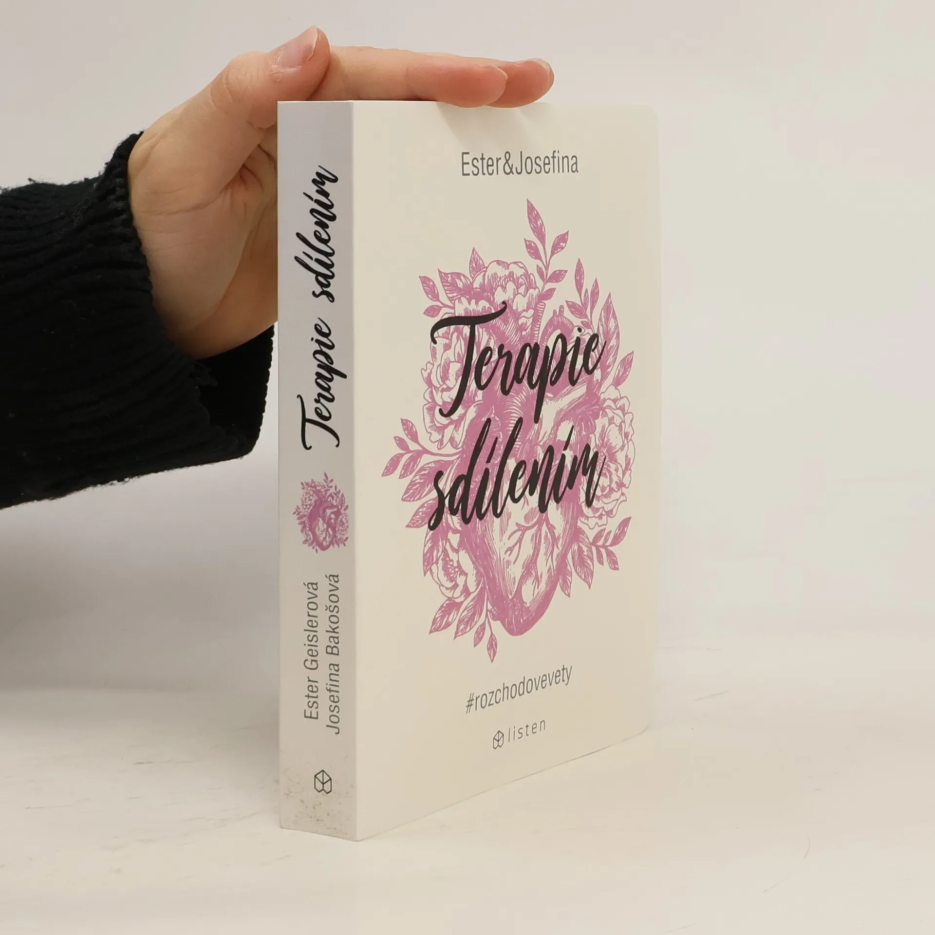 Za projektem Terapie sdílením, aktuální internetovou senzací, stojí kreativní dvojice Ester Geislerová a Josefina Bakošová. Před několika měsíci vystavily na svých sociálních sítích několik mrazivých, a zároveň cynický úsměv vzbuzujících vět, kterými se jistý muž rozešel s jejich kamarádkou. Toto malé gesto spustilo lavinu; během následujících týdnů jim čtenáři začali posílat své rozchodové věty a hashtag „terapie sdilenim“ se stal doslova kultovním. Kniha je věrným obrazem autentického prostředí internetových chatů a messengerů, kde se dnes tak často odehrávají trpké konce vztahů. Sebrané věty fungují opravdu jako svébytná terapie; při četbě a úlevném smíchu si člověk rád připomene, že tak zle na tom přece jen ještě není. Kniha je doplněna texty obou autorek, esejí mediálního teoretika Tomáše Dvořáka, osobními fotkami, vzkazy a dalšími materiály Ester a Josefiny.