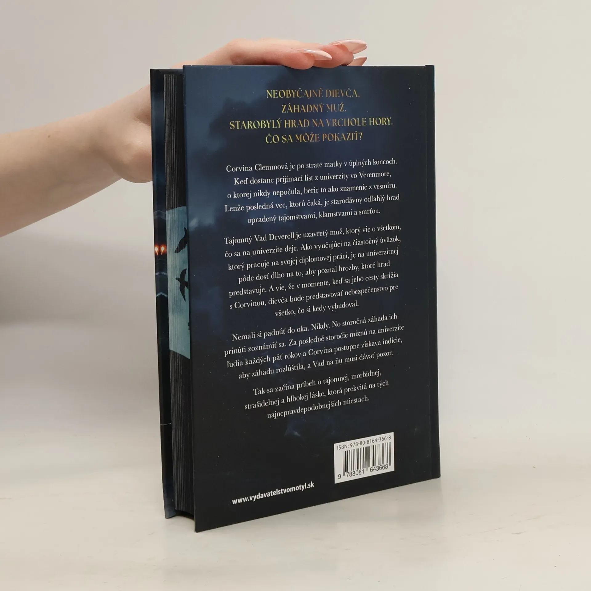 Nezvyčajné dievča. Tajomný muž. Starobylý hrad. Čo sa môže pokaziť? Corvina Clemmová, ktorá bola celý život vyvrheľka, je po strate matky v úplných koncoch. Keď dostane prijímací list z tajomnej univerzity vo Verenmore, berie to ako znamenie z vesmíru. Lenže posledná vec, ktorú čaká, je starodávny odľahlý hrad na vrchole hory opradený tajomstvami, klamstvami a smrťou. Záhadný Vad Deverell je uzavretý muž, ktorý vie o všetkom, čo sa na univerzite deje. Ako vyučujúci na čiastočný úväzok, ktorý pracuje na svojej diplomovej práci, je na univerzitnej pôde dosť dlho na to, aby poznal hrozby, ktoré hrad predstavuje. A vie, že v momente, keď sa jeho cesty skrížia s Corvinou, dievča bude predstavovať nebezpečenstvo pre všetko, čo si kedy vybudoval. Nemali si padnúť do oka. Nikdy. No storočná záhada ich prinúti zoznámiť sa. Za posledné storočie miznú na univerzite ľudia každých päť rokov a Corvina postupne získava indície, aby záhadu rozlúštila, a Vad na ňu musí dávať pozor. Tak sa začína príbeh o tajomnej, morbídnej, strašidelnej a hlbokej láske, ktorá prekvitá na tých najnepravdepodobnejších miestach.