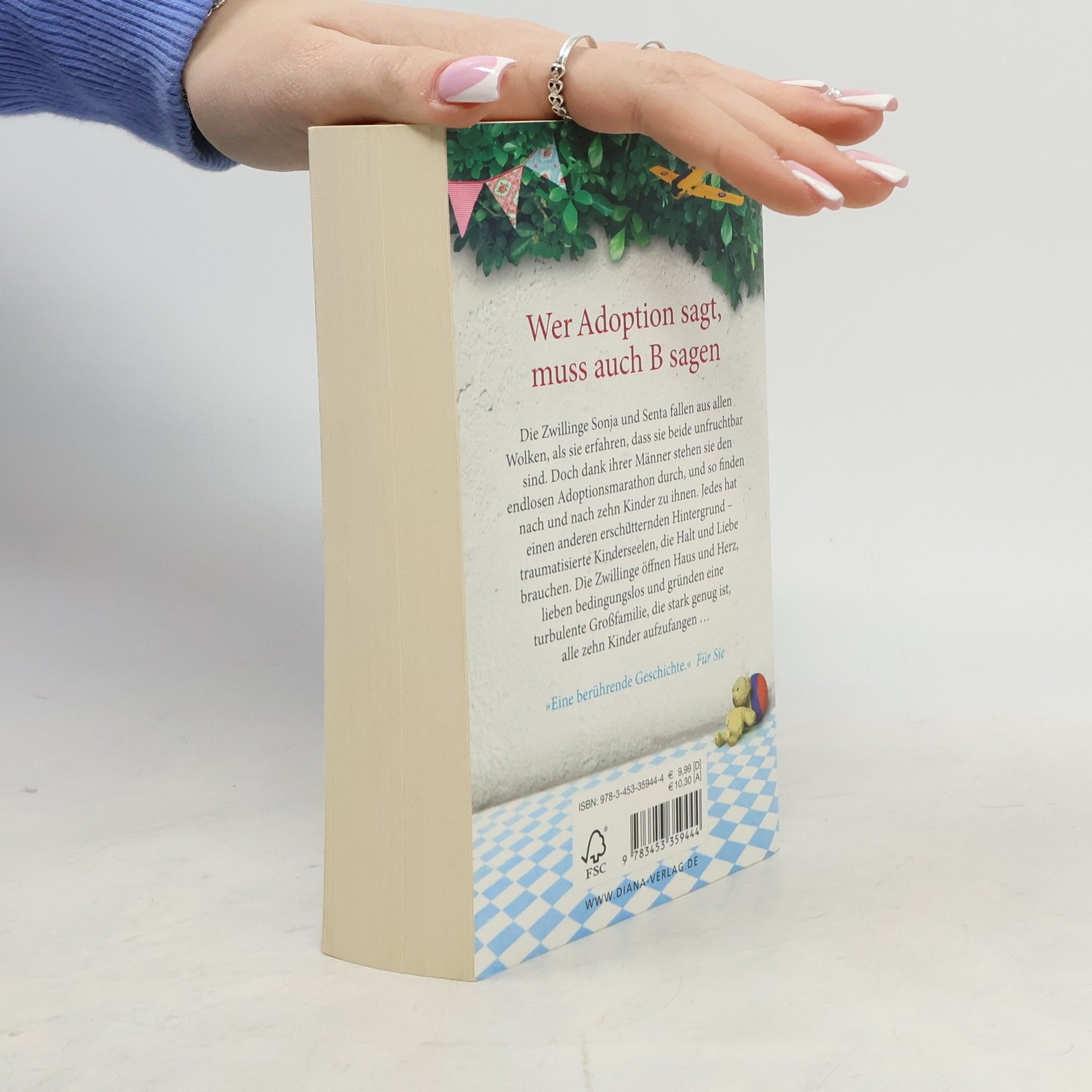 Wer Adoption sagt, muss auch B sagen Die Zwillinge Sonja und Senta fallen aus allen Wolken, als sie erfahren, dass sie beide unfruchtbar sind. Doch dank ihrer Männer stehen sie den endlosen Adoptionsmarathon durch, und so finden nach und nach zehn Kinder zu ihnen. Jedes hat einen anderen erschütternden Hintergrund – traumatisierte Kinderseelen, die Halt und Liebe brauchen. Die Zwillinge öffnen Haus und Herz, lieben bedingungslos und gründen eine turbulente Großfamilie, die stark genug ist, alle zehn Kinder aufzufangen …Eine berührende Geschichte voller Mut und Konsequenz und dem unerschütterlichen Glauben an die Kraft der Familie