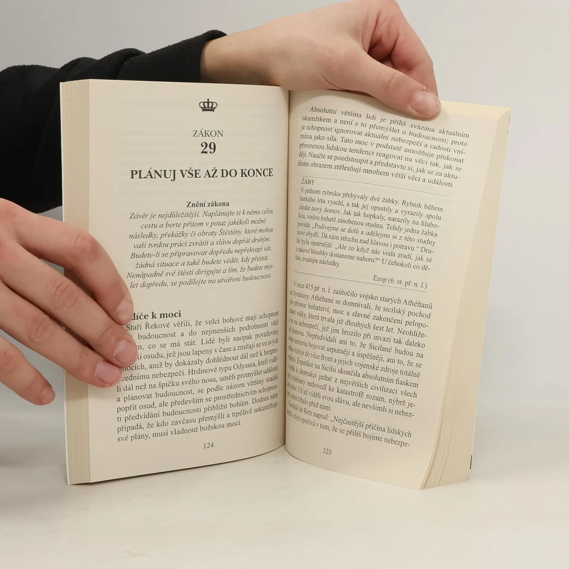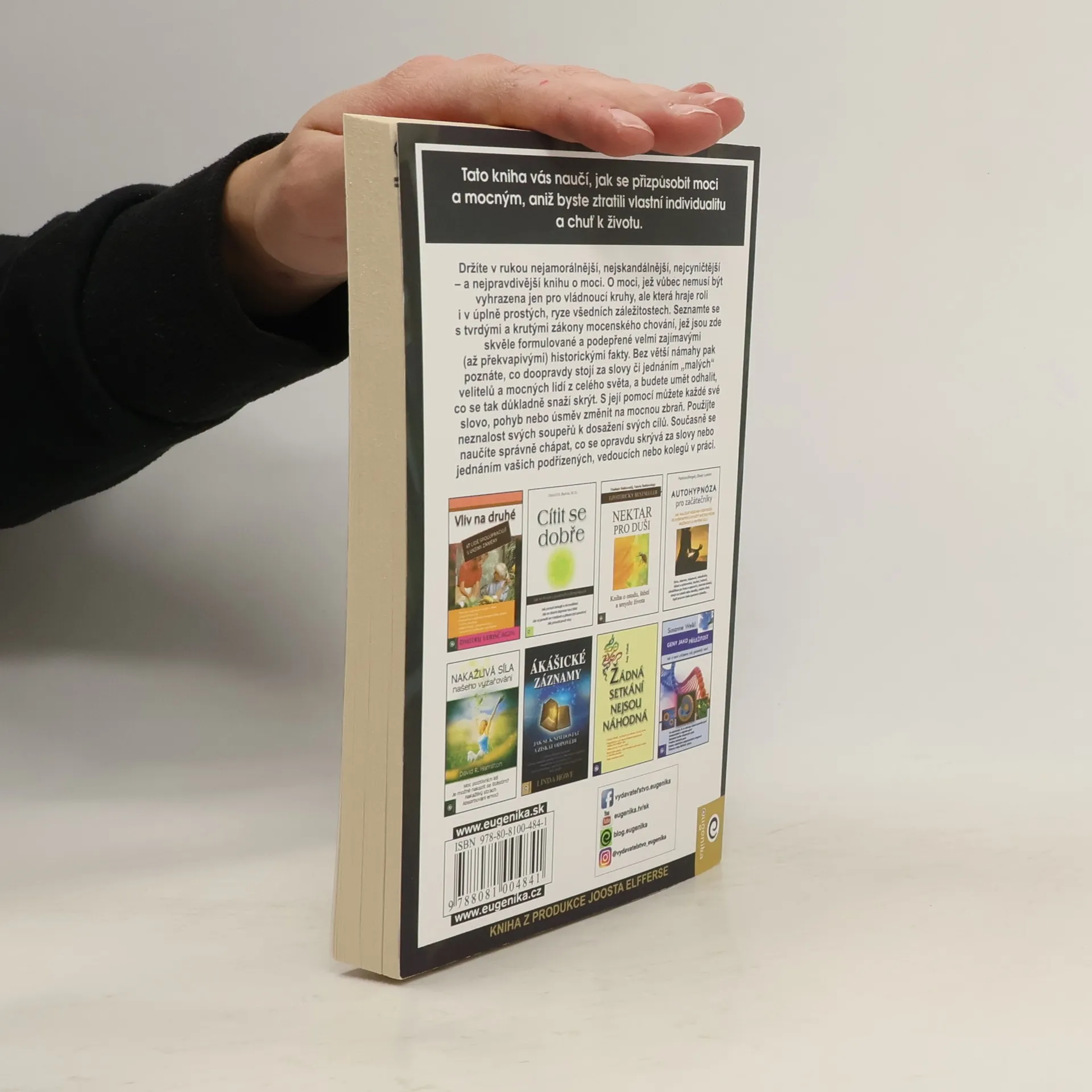 Kniha Roberta Greena z roku 1998 tematicky navazuje na Vladaře Niccola Machiavelliho a prezentuje zákony moci prostřednictvím reálných historických příběhů (např. Ludvík XIV., Talleyrand, Otto von Bismarck, Kateřina Veliká, Mao Ce-tung, Haile Selassie). Greene nechává čtenáře posoudit etiku používání těchto pravidel. Někteří ji považují za nástroj pro dosažení moci a úspěchu, jiní za praktickou příručku. Již dvě desetiletí je bestsellerem o moci a zůstává jednou z nejčtenějších knih na toto téma. Pokud se považujete za ambiciózní, kniha vás naučí rozpoznávat a ovládat myšlenky a přání druhých, což usnadní váš kariérní postup. Autor, expert na lidskou psychologii, poskytuje desítky příkladů správného jednání v konkrétních situacích a ukazuje, jak i z prohrané pozice lze směřovat k vítězství. Čtenář se seznámí s nestandardními metodami vyjednávání a řízení, přičemž každé tvrzení je podloženo konkrétními příklady. Kniha přehledně formuluje základní pravidla chování, která mají vědecký základ a doporučené postupy. S pomocí jejích rad můžete proměnit svá slova, pohyby či úsměvy na mocné nástroje. Naučíte se také správně chápat skryté úmysly za slovy a jednáním vašich kolegů či nadřízených.