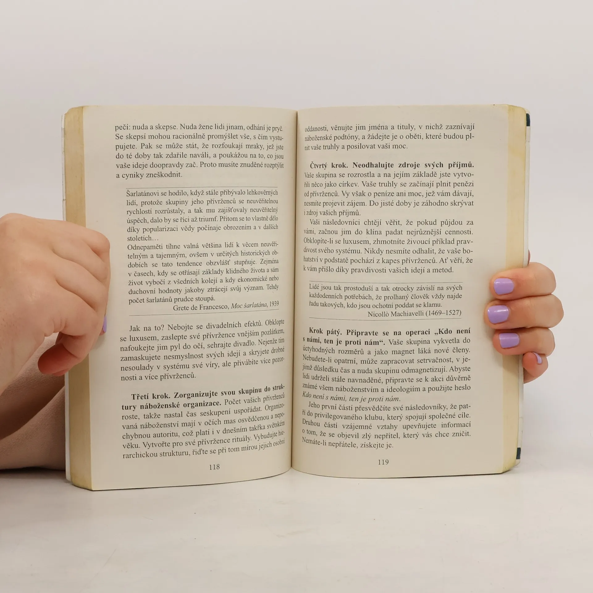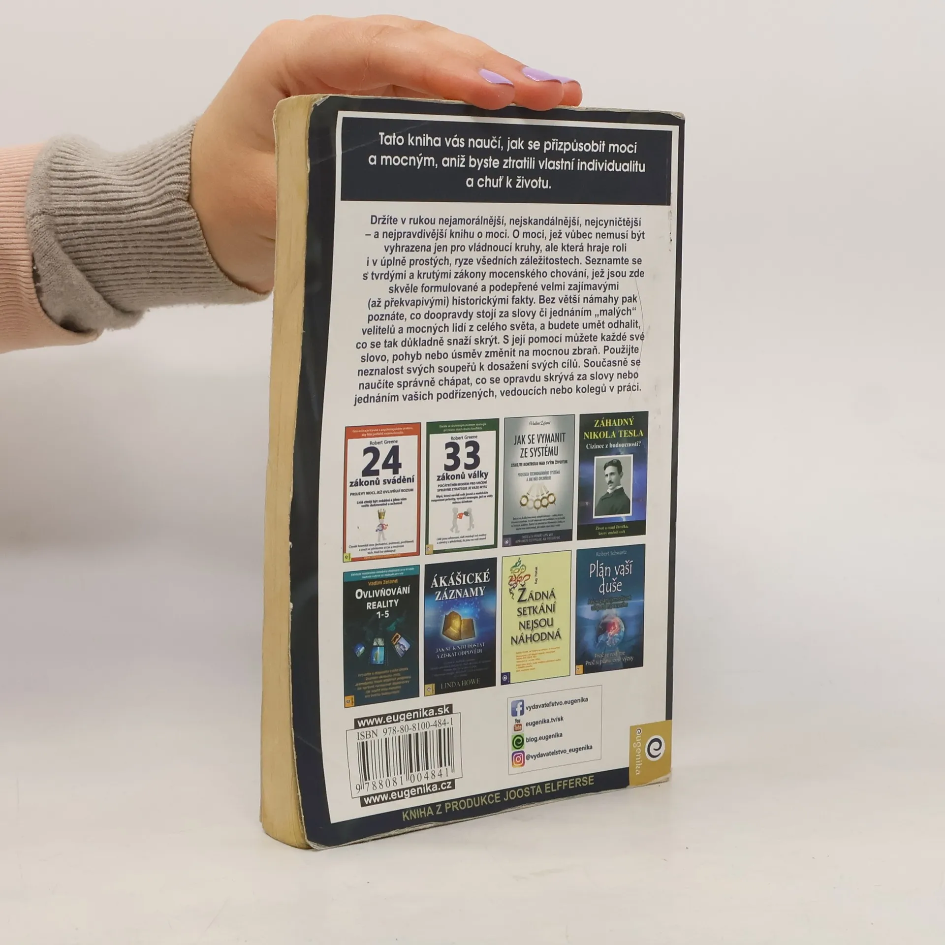 Kniha Roberta Greena z roku 1998 tematicky navazuje na Vladaře Niccola Machiavelliho a prezentuje zákony moci prostřednictvím reálných historických příběhů (např. Ludvík XIV., Talleyrand, Otto von Bismarck, Kateřina Veliká, Mao Ce-tung, Haile Selassie). Greene nechává čtenáře posoudit etiku používání těchto pravidel. Někteří ji považují za nástroj pro dosažení moci a úspěchu, jiní za praktickou příručku. Již dvě desetiletí je bestsellerem o moci a zůstává jednou z nejčtenějších knih na toto téma. Pokud se považujete za ambiciózní, kniha vás naučí rozpoznávat a ovládat myšlenky a přání druhých, což usnadní váš kariérní postup. Autor, expert na lidskou psychologii, poskytuje desítky příkladů správného jednání v konkrétních situacích a ukazuje, jak i z prohrané pozice lze směřovat k vítězství. Čtenář se seznámí s nestandardními metodami vyjednávání a řízení, přičemž každé tvrzení je podloženo konkrétními příklady. Kniha přehledně formuluje základní pravidla chování, která mají vědecký základ a doporučené postupy. S pomocí jejích rad můžete proměnit svá slova, pohyby či úsměvy na mocné nástroje. Naučíte se také správně chápat skryté úmysly za slovy a jednáním vašich kolegů či nadřízených.