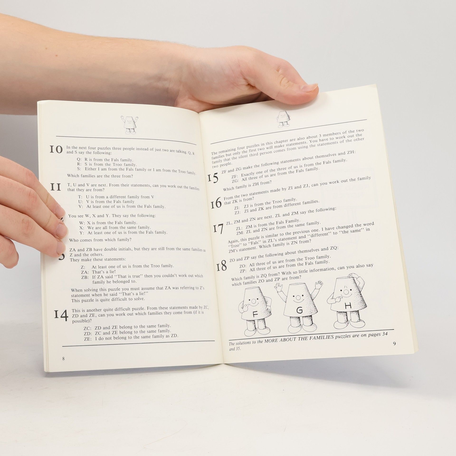 All the characters in these puzzles make clear statements about themseves and others, but it is not clear whether or not they are telling the truth. The problem is to decide which person to believe. Also, there are some curious paradoxical pictures which raise questions to answer.