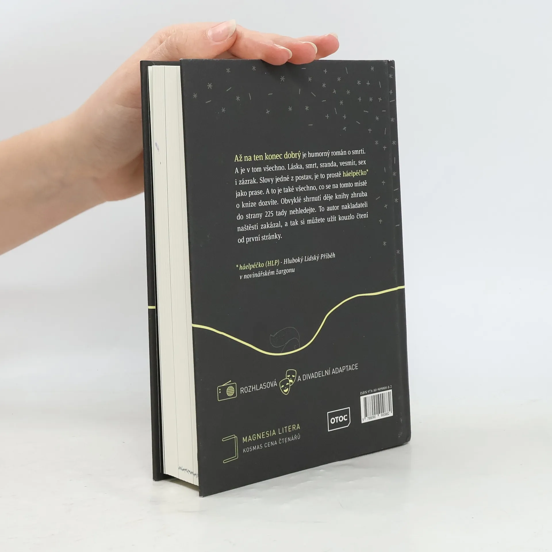 Humorný román o smrti. A je v tom všechno. Láska, smrt, sranda, vesmír, sex i zázrak. Slovy jedné z postav, je to prostě „háelpéčko* jako prase“. (*háelpéčko (HLP) –Hluboký Lidský Příběh v novinářském žargonu) Pavel Tomeš je stand-up komik, kterého můžete znát z TV pořadů Comedy club a Na stojáka. Vydal sbírky fejetonů Tohle lidi hodně berou, Zápisky malého tyranosaura a Facky z Marsu.