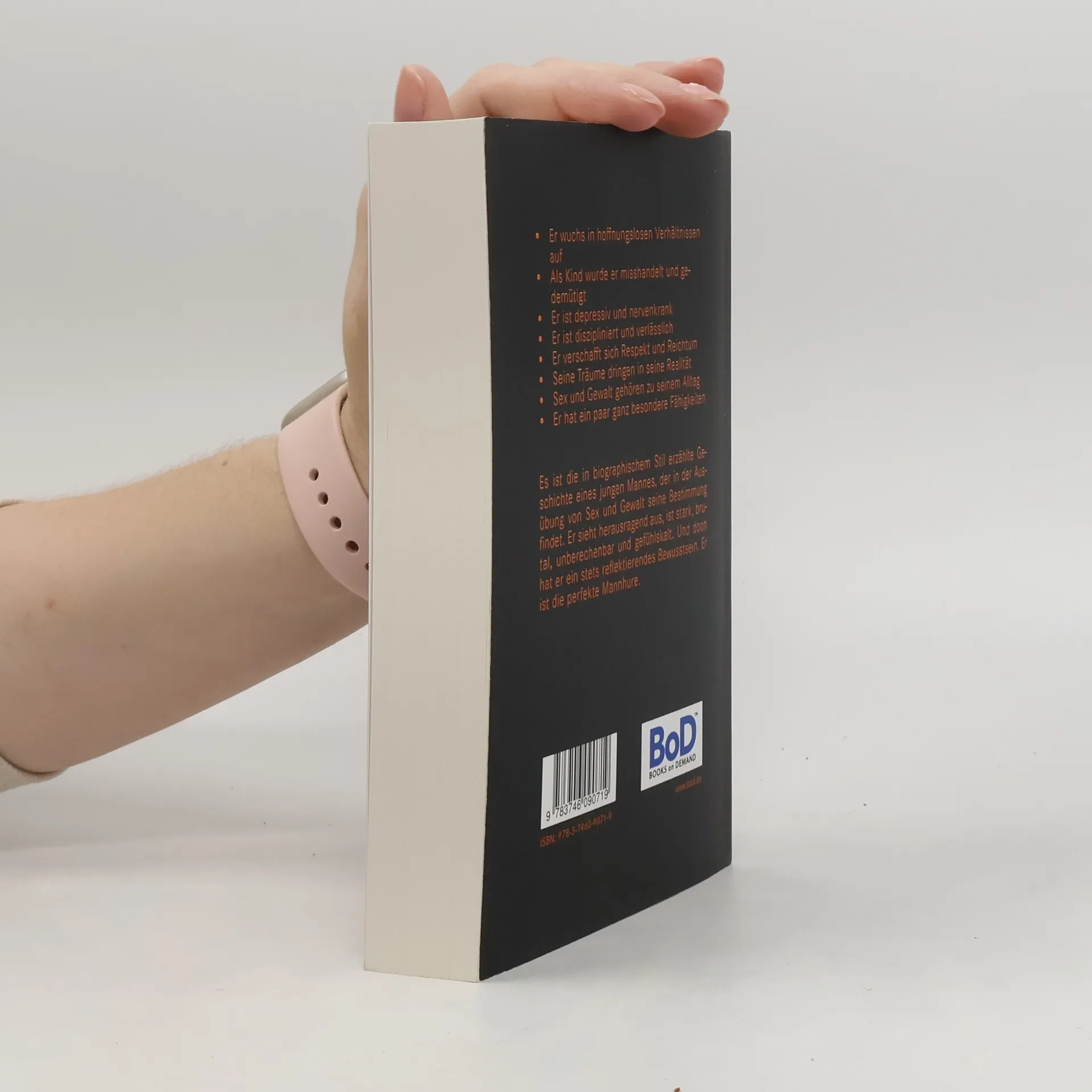 Er wuchs in hoffnungslosen Verhältnissen auf Als Kind wurde er misshandelt und gedemütigt Er ist depressiv und nervenkrank Er ist diszipliniert und verlässlich Er verschafft sich Respekt und Reichtum Seine Träume dringen in seine Realität Sex und Gewalt gehören zu seinem Alltag Er hat ein paar ganz besondere Fähigkeiten Dies ist die in biographischem Stil erzählte Geschichte eines jungen Mannes, der in der Ausübung von Sex und Gewalt seine Bestimmung findet. Er sieht herausragend aus, ist stark, brutal, unberechenbar und gefühlskalt. Und doch hat er ein stets reflektierendes Bewusstsein. Er ist die perfekte "Mannhure".