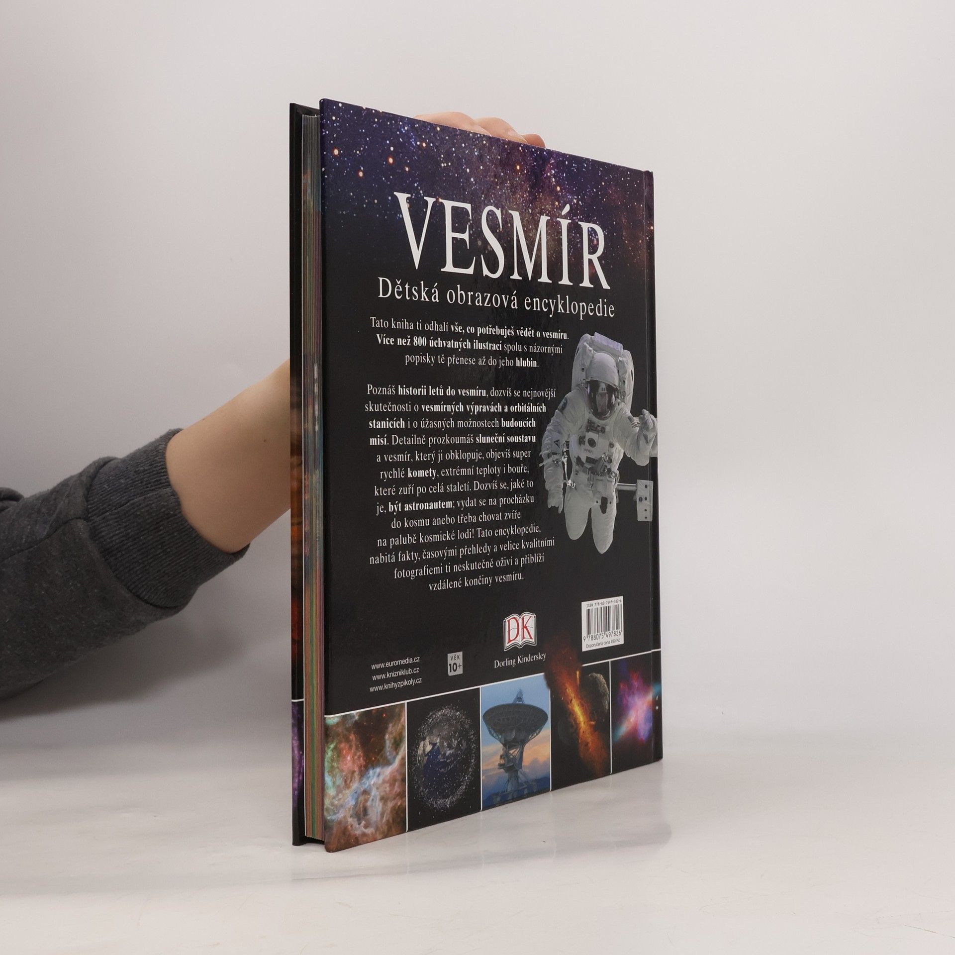 Tato dětská obrazová encyklopedie čtenářům od 10 let odhalí vše, co se touží dozvědět o vesmíru. Více než 800 úchvatných ilustrací spolu s názornými popisky je přenese do jeho hlubin. Poznají historii letů do vesmíru, dozvědí se nejnovější skutečnosti o vesmírných výpravách a orbitálních stanicích i o úžasných možnostech budoucích misí. Detailně prozkoumají sluneční soustavu a vesmír, který ji obklopuje, objeví super rychlé komety, extrémní teploty i bouře, které zuří po celá staletí. Dozvědí se, jaké to je, být astronautem, vydat se na procházku do kosmu anebo třeba chovat zvíře na palubě kosmické lodi!
