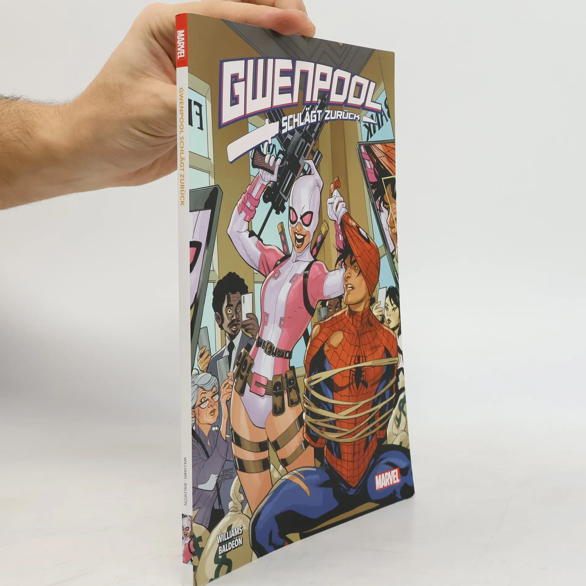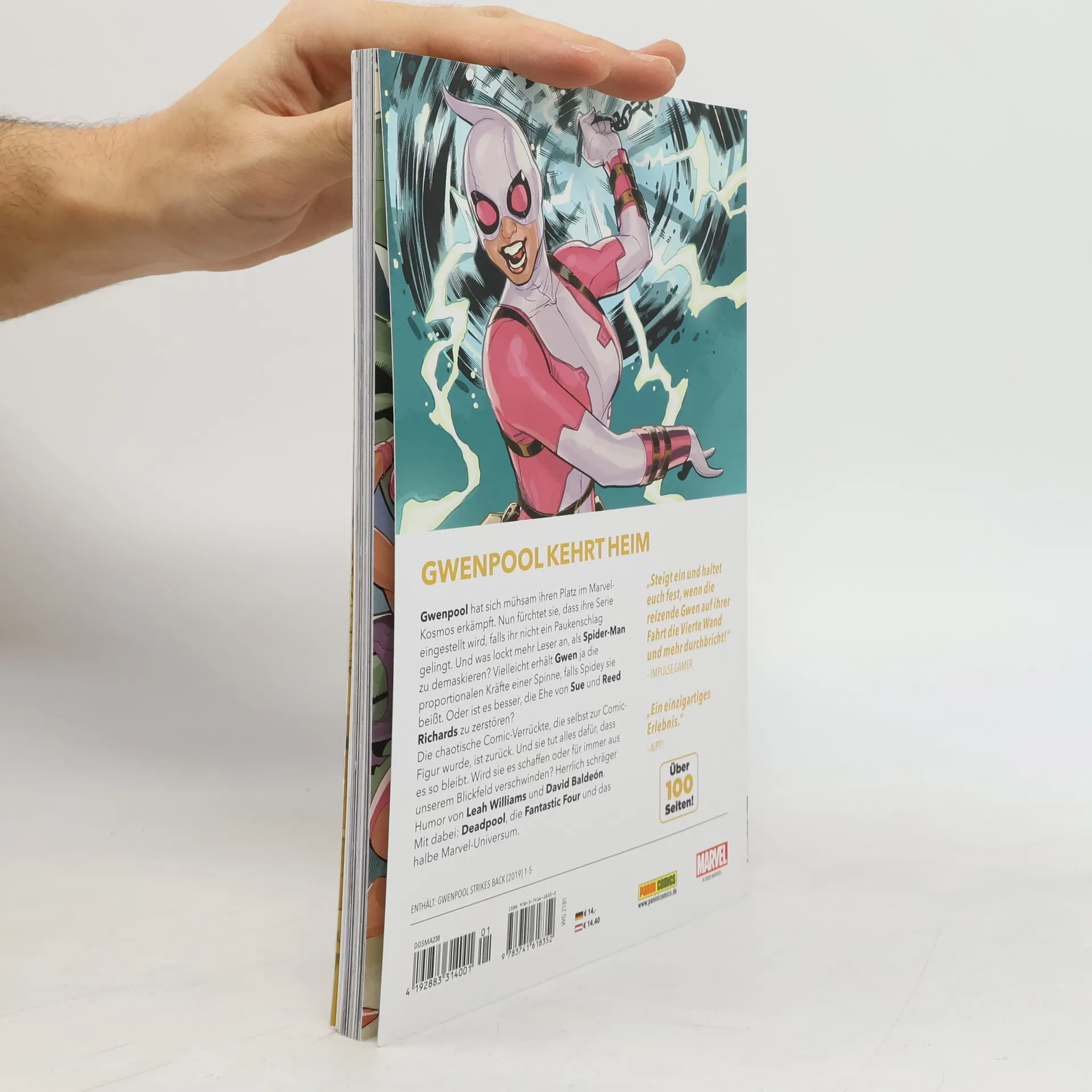 GWENPOOL KEHRT HEIM Gwenpool hat sich mühsam ihren Platz im Marvel-Kosmos erkämpft. Nun fürchtet sie, dass ihre Serie eingestellt wird, falls ihr nicht ein Paukenschlag gelingt. Und was lockt mehr Leser an, als Spider-Man zu demaskieren? Vielleicht erhält Gwen ja die proportionalen Kräfte einer Spinne, falls Spidey sie beißt. Oder ist es besser, die Ehe von Sue und Reed Richards zu zerstören? Die chaotische Comic-Verrückte, die selbst zur Comic-Figur wurde, ist zurück. Und sie tut alles dafür, dass es so bleibt. Wird sie es schaffen oder für immer aus unserem Blickfeld verschwinden? Herrlich schräger Humor von Leah Williams und David Baldeón. Mit dabei: Deadpool, die Fantastic Four und das halbe Marvel-Universum. ENTHÄLT: GWENPOOL STRIKES BACK (2019) 1-5