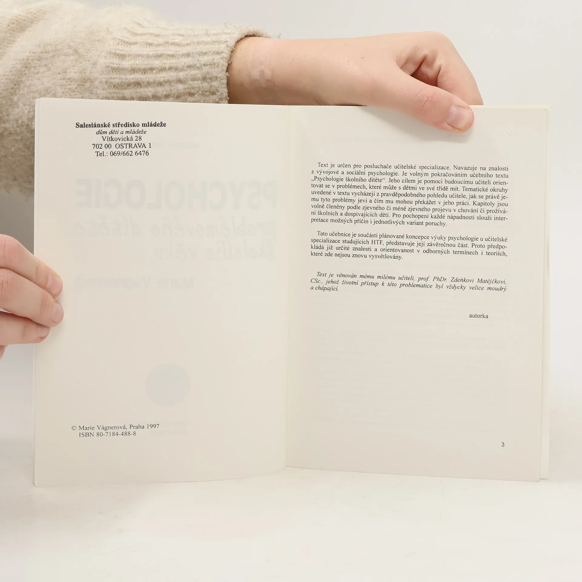 Prof. PhDr. RNDr. Marie Vágnerová, CSc.: Psychologie problémového dítěte školního věku. Jako skripta pro posluchače Husitské teologické fakulty Univerzity Karlovy. "Text je určen pro posluchače učitelské specializace. Navazuje na znalosti z vývojové a sociální psychologie. Je volným pokračováním učebního textu "Psychologie školníhodítěte". Jeho cílem je pomoci budoucímu učiteli orientovat se v problémech, které může s dětmi ve třídě mít. ... ... Tato učebnice je součástí plánované koncepce výuky psychologie u učitelské specializace studujících HTF, představuje její závěrečnou část. Proto předpokládá již určité znalosti a orientovanostvodborných termínech i teoriích, které zde nejsou znovu vysvětlovány. ... ..." (úvod, 1997) ISBN: 382-119-97 a ISBN: 80-7148-488-8