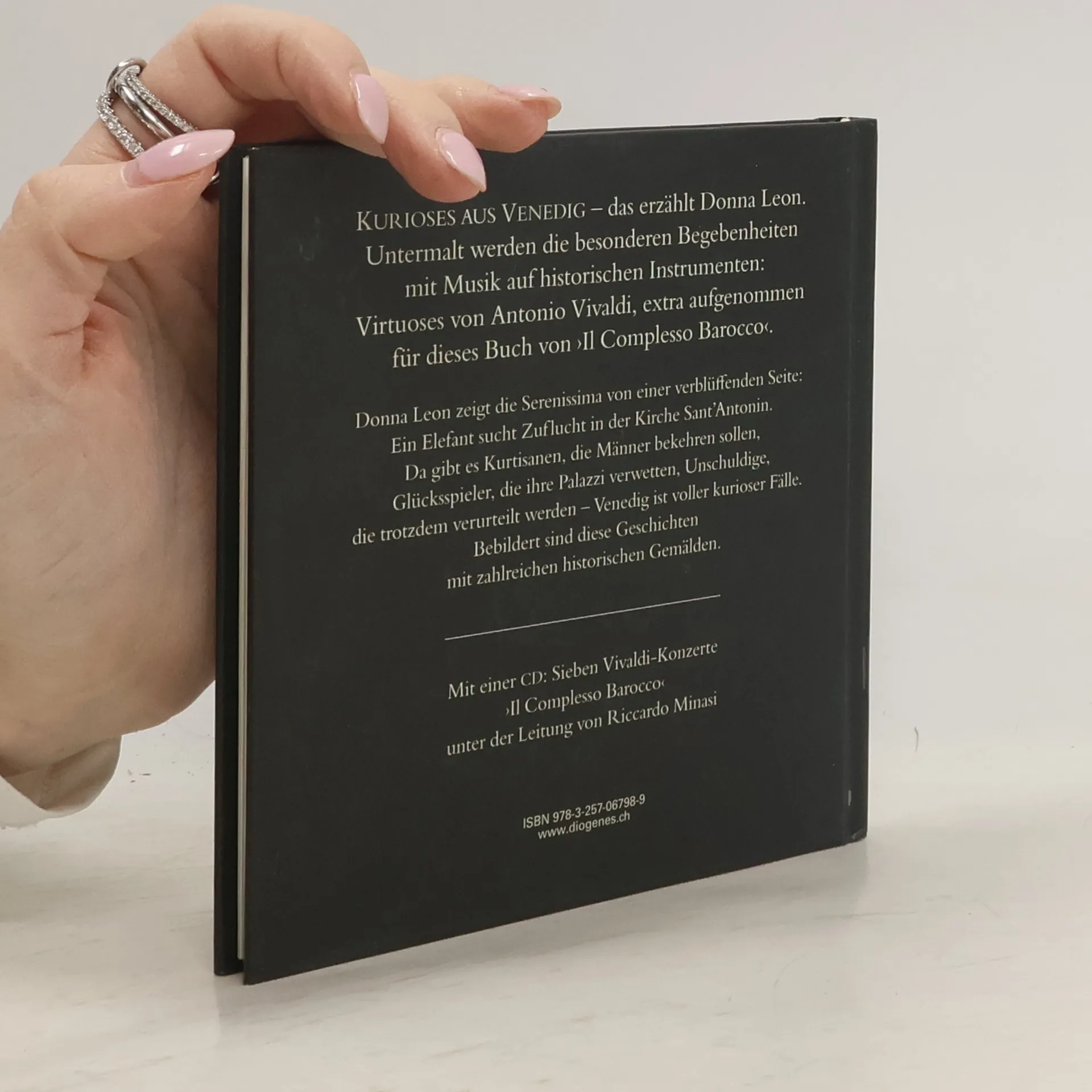 ›Kurioses aus Venedig‹ – das erzählt Donna Leon. Untermalt werden die besonderen Begebenheiten mit Musik auf historischen Instrumenten: Virtuoses von Antonio Vivaldi, extra aufgenommen für dieses Buch von ›Il Complesso Barocco‹.