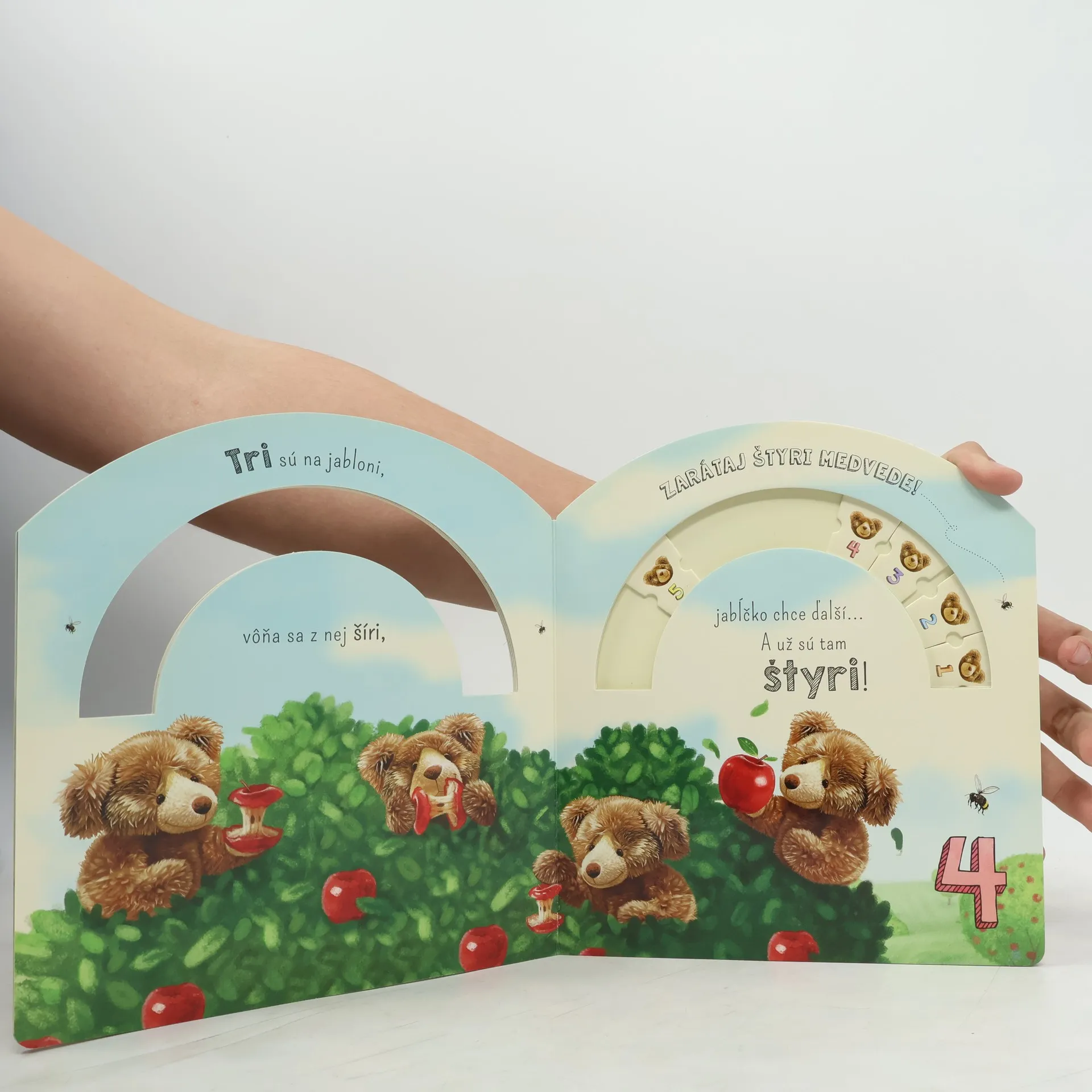 Medveď sa učí RÁTAŤ Jeden malý medveď rád sa s kamarátmi hráva... Sledujte medvedíkove dobrodružstvá a pomôžte mu naučiť sa rátať. Vždy, keď obrátite stránku, dotknite sa medvedíkov a určte ich počet.