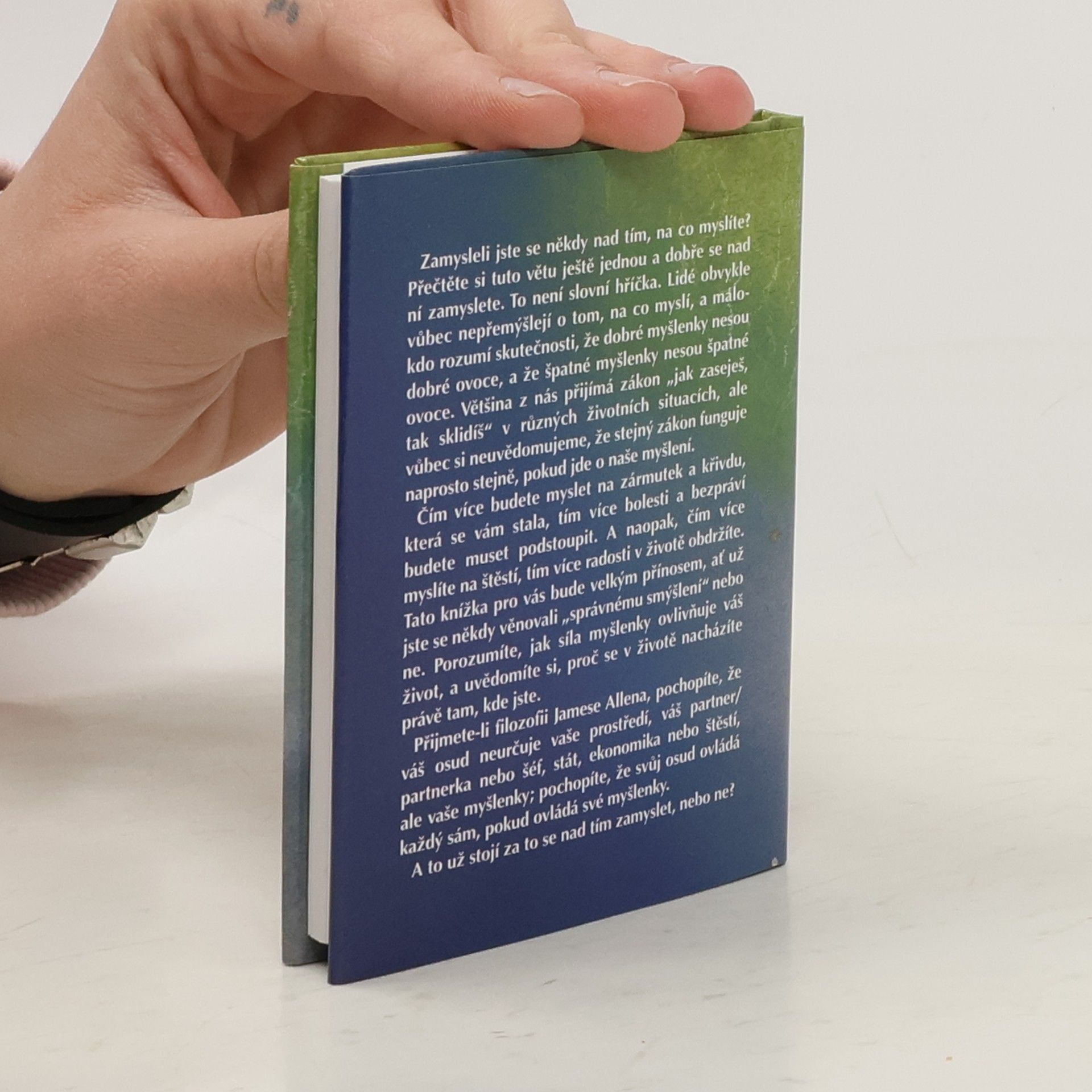 Zamysleli jste se někdy nad tím, na co myslíte? Přečtěte si tuto větu ještě jednou a dobře se nad ní zamyslete. To není slovní hříčka. Lidé obvykle vůbec nepřemýšlejí o tom, na co myslí, a málokdo rozumí skutečnosti, že dobré myšlenky nesou dobré ovoce, a že špatné myšlenky nesou špatné ovoce. Většina z nás přijímá zákon „jak zaseješ, tak sklidíš“ v různých životních situacích, ale vůbec si neuvědomujeme, že stejný zákon funguje naprosto stejně, pokud jde o naše myšlení. Čím více budete myslet na zármutek a křivdu, která se vám stala, tím více bolesti a bezpráví budete muset podstoupit. A naopak, čím více myslíte na štěstí, tím více radosti v životě obdržíte. Tato knížka pro vás bude velkým přínosem, ať už jste se někdy věnovali „správnému smýšlení“ nebo ne. Porozumíte, jak síla myšlenky ovlivňuje váš život, a uvědomíte si, proč se v životě nacházíte právě tam, kde jste. Přijmete-li filozofii Jamese Allena, pochopíte, že váš osud neurčuje vaše prostředí, váš partner/partnerka nebo šéf, stát, ekonomika nebo štěstí, ale vaše myšlenky; pochopíte, že svůj osud ovládá každý sám, pokud ovládá své myšlenky. A to už stojí za to se nad tím zamyslet, nebo ne?