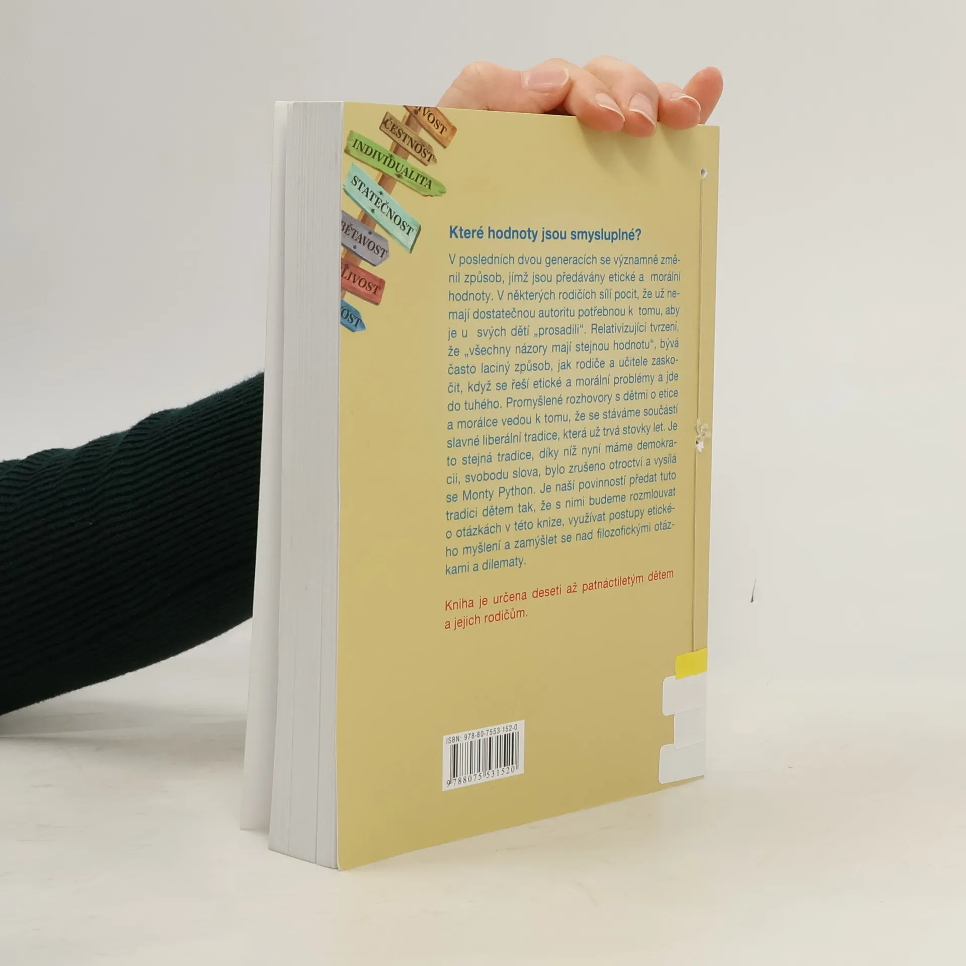 Povídejte si s dětmi o etice: poctivost, přátelství, tolerance a dalších 106 věcí, na kterých opravdu záleží V posledních dvou generacích se významně změnil způsob, jímž jsou předávány etické a morální hodnoty. V některých rodičích sílí pocit, že už nemají dostatečnou autoritu potřebnou k tomu, aby je u svých dětí „prosadili“. Relativizující tvrzení, že „všechny názory mají stejnou hodnotu“, bývá často laciný způsob, jak rodiče a učitele zaskočit, když se řeší etické a morální problémy a jde do tuhého. Promyšlené rozhovory s dětmi o etice a morálce vedou k tomu, že se stáváme součástí slavné liberální tradice, která už trvá stovky let. Je to stejná tradice, díky níž nyní máme demokracii, svobodu slova, bylo zrušeno otroctví a vysílá se Monty Python. Je naší povinností předat tuto tradici dětem tak, že s nimi budeme rozmlouvat o otázkách v této knize, využívat postupy etického myšlení a zamýšlet se nad filozofickými otázkami a dilematy.
