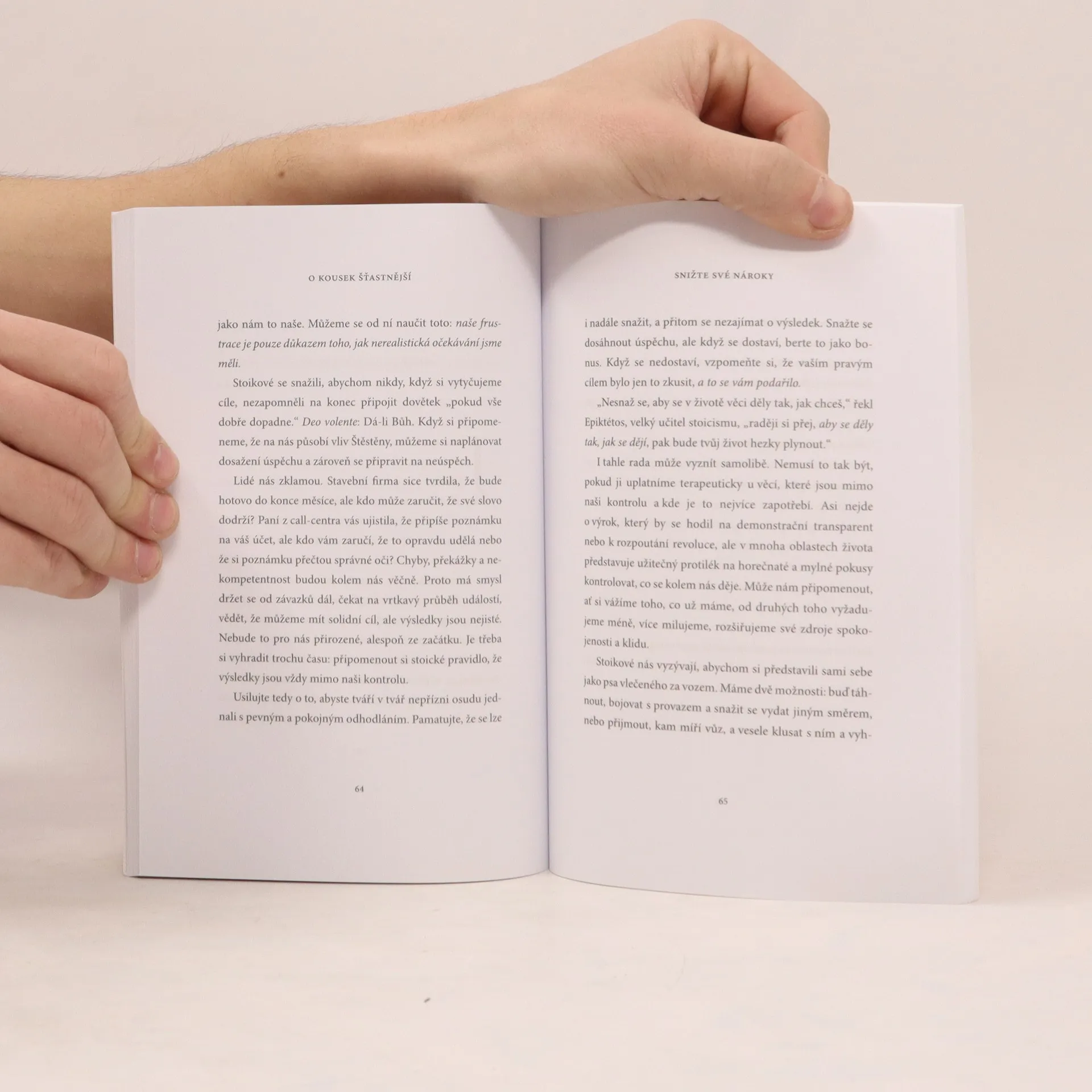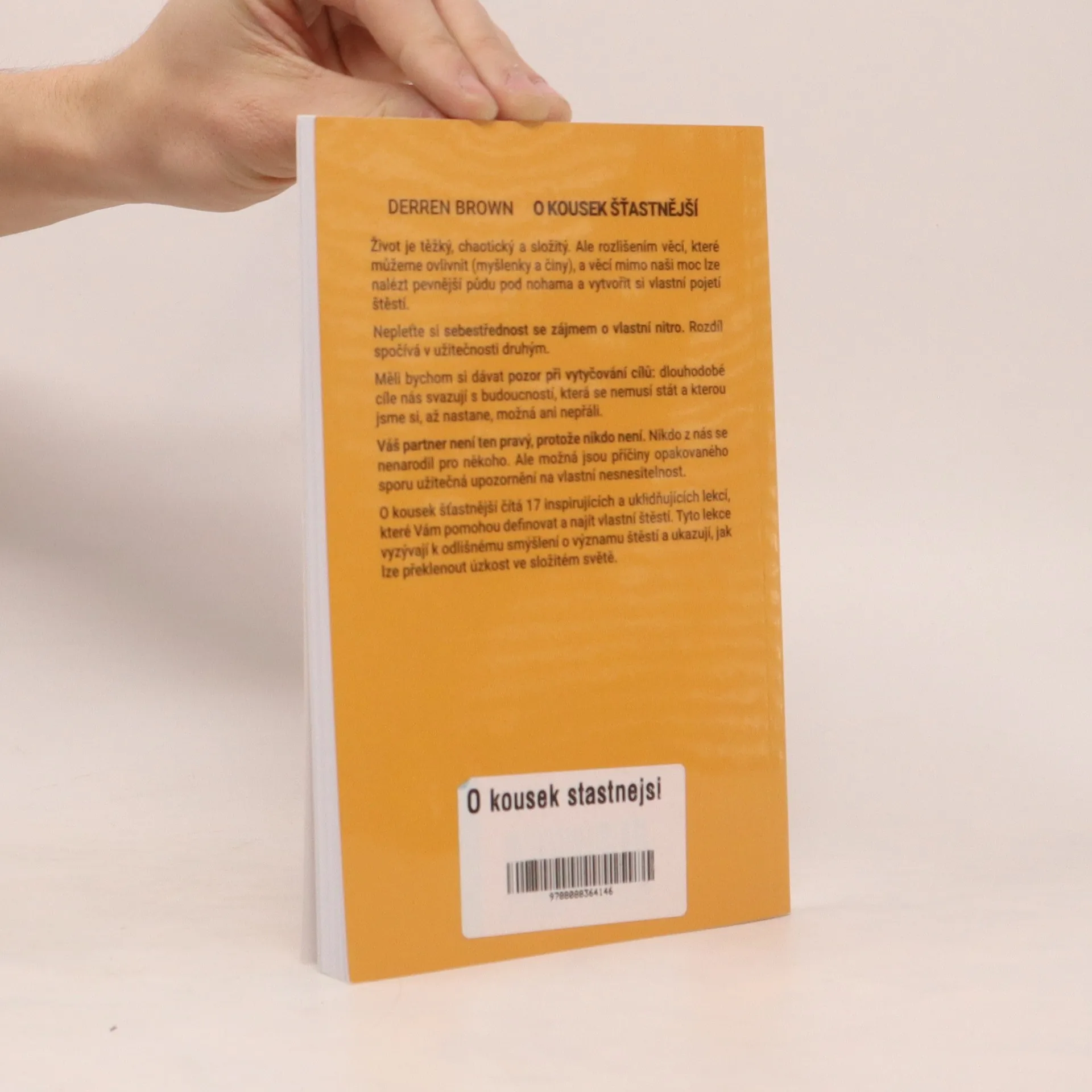 Život je těžký, chaotický a složitý. Ale rozlišením věcí, které můžeme ovlivnit (myšlenky a činy), a věcí mimo naši moc lze nalézt pevnější půdu pod nohama a vytvořit si vlastní pojetí štěstí. Nepleťte si sebestřednost se zájmem o vlastní nitro. Rozdíl spočívá v užitečnostidruhým. Měli bychom si dávat pozor při vytyčování cílů: dlouhodobé cíle nás svazují s budoucností, která se nemusí stát a kterou jsme si, až nastane, možná ani nepřáli. Váš partner není ten pravý, protože nikdo není. Nikdo z nás se nenarodil pro někoho. Ale možná jsou příčiny opakovaného sporu užitečná upozornění na vlastní nesnesitelnost. O kousek šťastnější čítá 17 inspirujících a uklidňujících lekcí, které Vám pomohou definovat a najít vlastní štěstí. Tyto lekce vyzývají k odlišnému smýšlení o významu štěstí a ukazují, jak lze překlenout úzkost ve složitém světě.