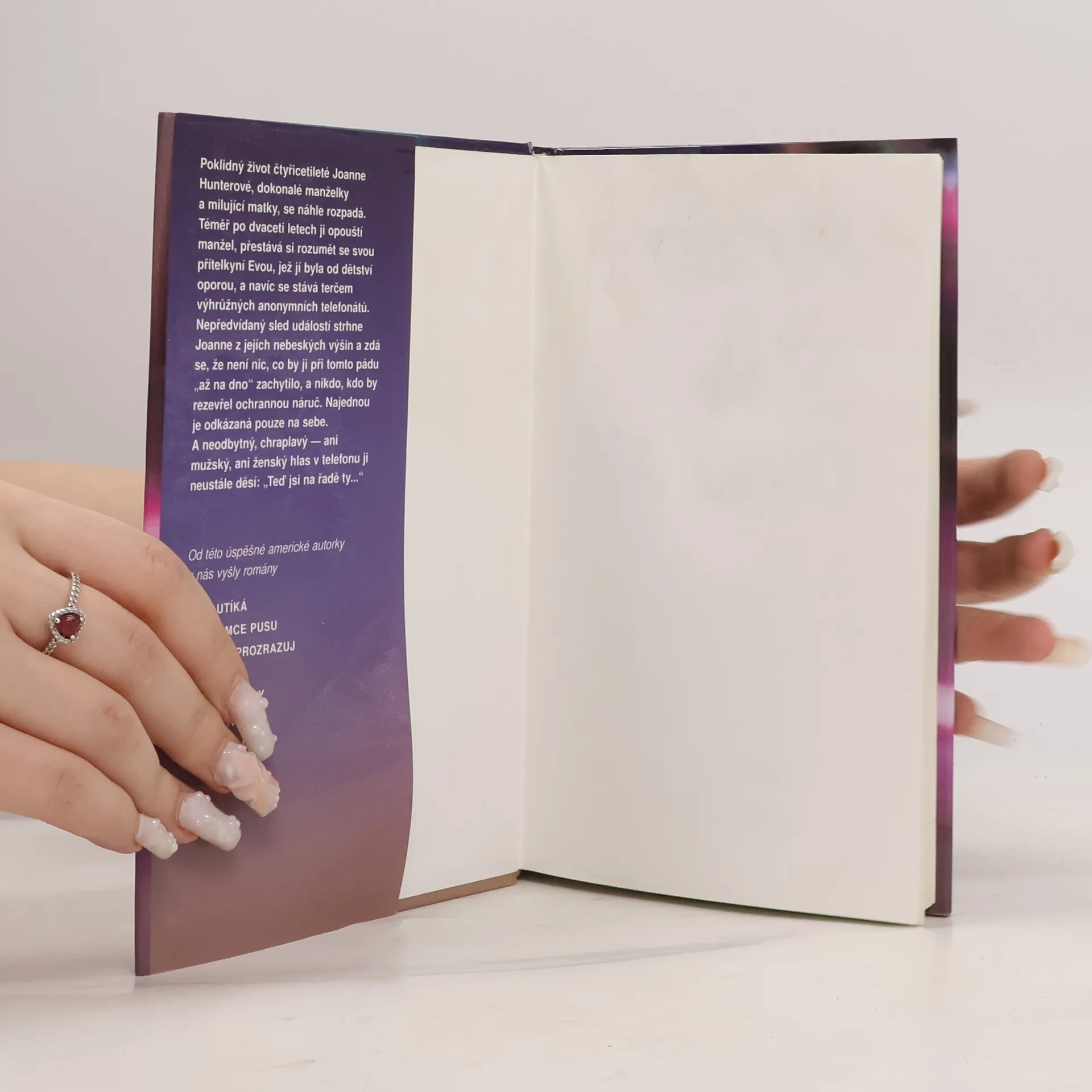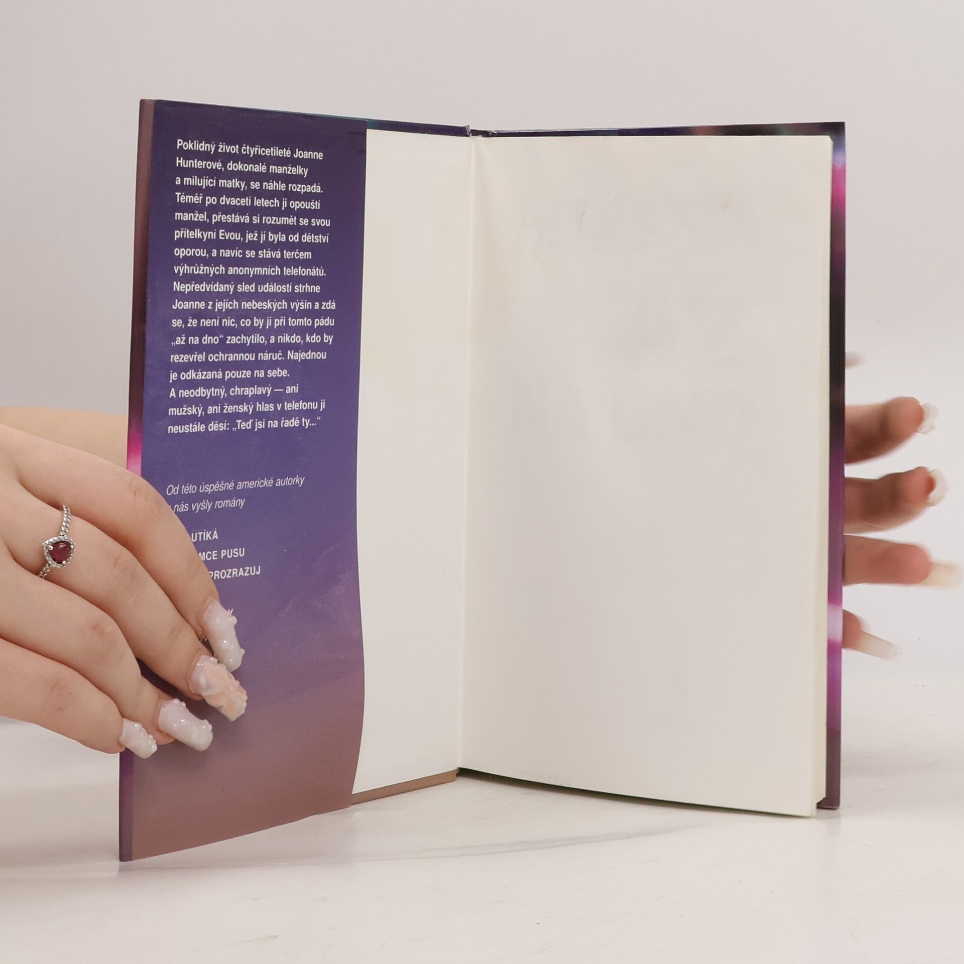 Poklidný život čtyřicetileté Joanne Hunterové, dokonalé manželky a milující matky, se náhle rozpadá. Téměř po dvaceti letech ji opouští manžel, přestává si rozumět se svou nejlepší přítelkyní Evou, jež jí byla od dětství oporou, a navíc se stává terčem výhrůžných anonymních telefonátů. Nepředvídaný sled událostí strhne Joanne z jejích nebeských výšin a zdá se, že není nic, co by ji při tomto pádu až na dno mohlo zachytit, a nikdo, kdo by rozevřel ochrannou náruč. Najednou je odkázaná pouze na sebe. A neodbytný, chraplavý – ani mužský, ani ženský – hlas v telefonu ji neustále děsí: „Teď jsi na řadě ty…“