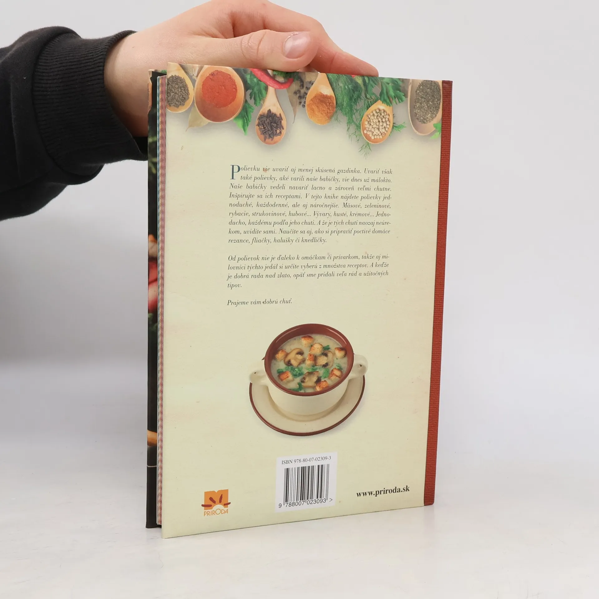 Polievku dokáže uvariť aj menej skúsená gazdinka. Uvariť však také polievky, aké varili naše babičky, vie dnes už málokto. Naše babičky vedeli navariť lacno a zároveň veľmi chutne. Inšpirujte sa ich receptami na jednoduché, každodenné, ale aj náročnejšie polievky určené na slávnostnú príležitosť. Nájdete tu mäsové, zeleninové, rybacie, strukovinové, hubové polievky, vývary, ale aj husté či krémové polievky... Jednoducho, každému podľa jeho chuti. A že je tých chutí naozaj neúrekom, zistíte sami. Naučíte sa aj, ako pripraviť poctivé domáce rezance, fliačky, halušky či knedličky. Od polievok nie je ďaleko k omáčkam či prívarkom, takže aj milovníci týchto jedál si určite prídu na svoje. A keďže dobrá rada je nad zlato, opäť sme pridali veľa užitočných tipov.