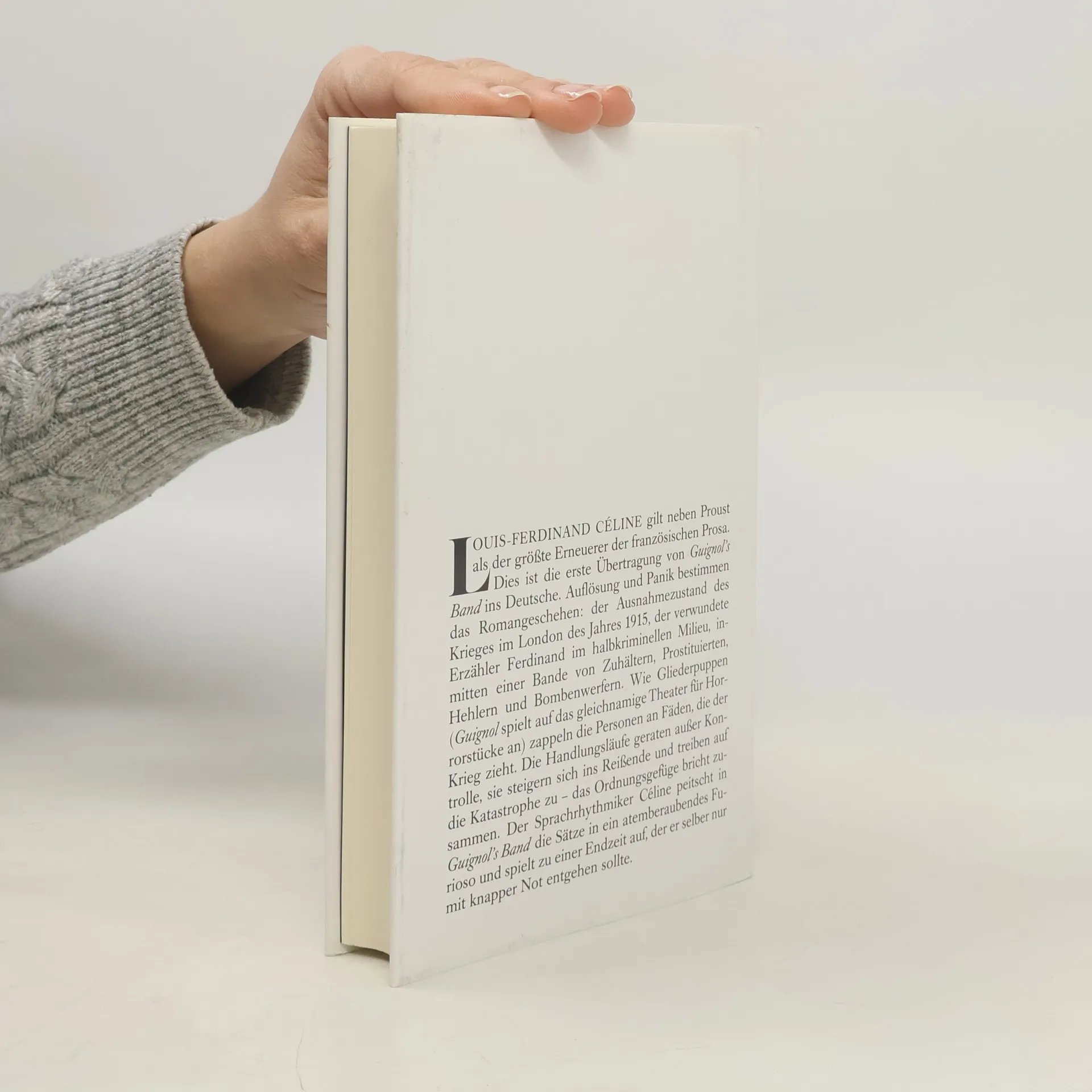 Dies ist die erste Übertragung von Guignol s Band ins Deutsche. Auflösung und Panik bestimmen das Romangeschehen: der Ausnahmezustand des Krieges im London des Jahres 1915, der verwundete Erzähler Ferdinand im halbkriminellen Milieu, inmitten einer Bande von Zuhältern, Prostituierten, Hehlern und Bombenwerfern. Wie Gliederpuppen (Guignol spielt auf das gleichnamige Theater für Horrorstücke an) zappeln die Personen an Fäden, die der Krieg zieht. Die Handlungsabläufe geraten außer Kontrolle, sie steigern sich ins Reißende und treiben auf die Katastrophe zu - das Ordnungsgefüge bricht zusammen. Der Sprachrhythmiker Céline peitscht die Sätze in ein atemberaubendes Furioso und spielt zu einer Endzeit auf, der er selber nur mit knapper Not entgehen sollte.