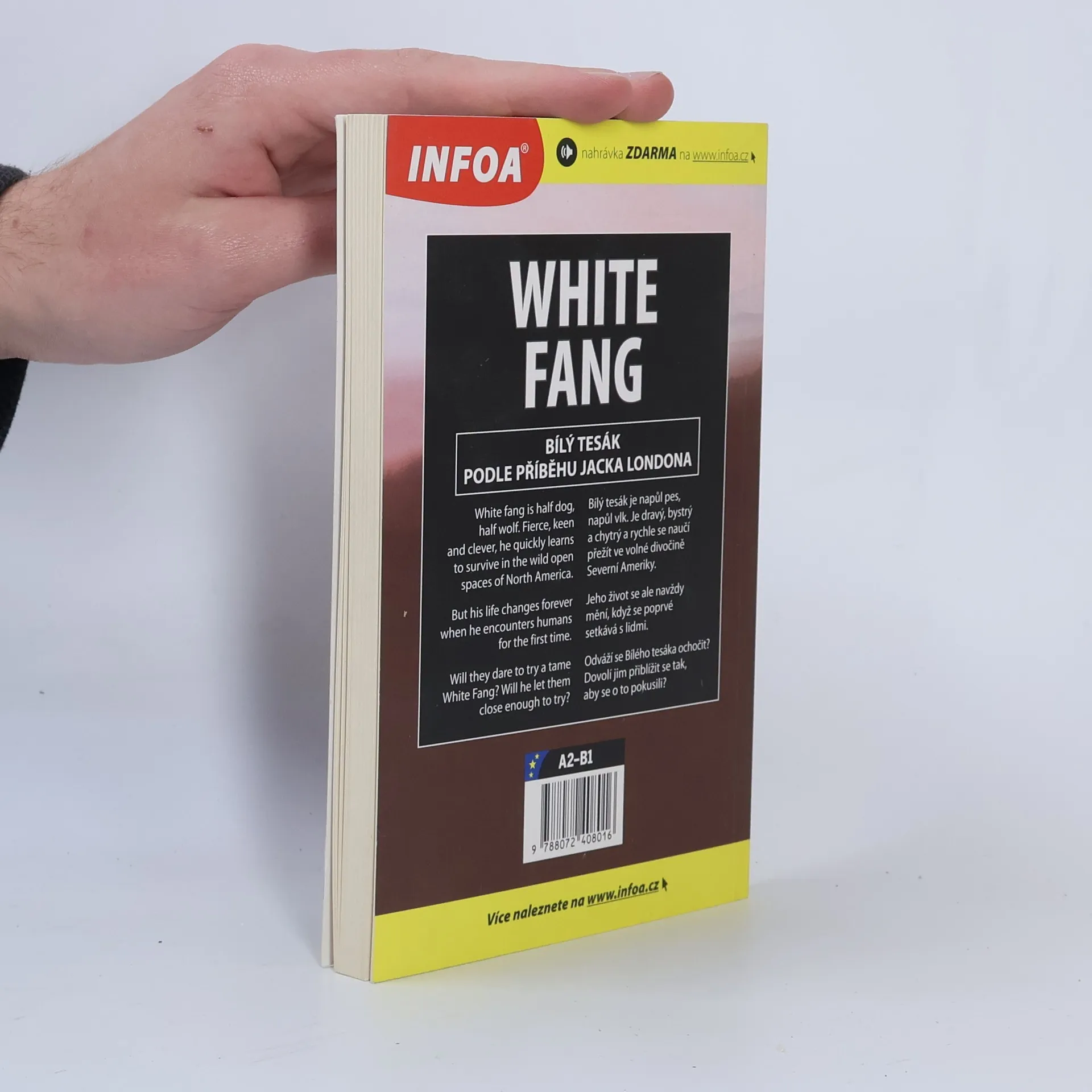 Adaptace příběhu Jacka Londona. Jazyková úroveň: Mírně pokročilí. Podle příběhu Jacka Londona. Bílý tesák je napůl pes, napůl vlk. Je dravý, bystrý a chytrý a rychle se naučí přežít ve volné divočině Severní Ameriky. Jeho život se ale navždy mění, když se poprvé setkává s lidmi. Odváží se Bílého tesáka ochočit? Dovolí jim přiblížit se tak, aby se o to pokusili? Nahrávky ZDARMA na infoa.cz.