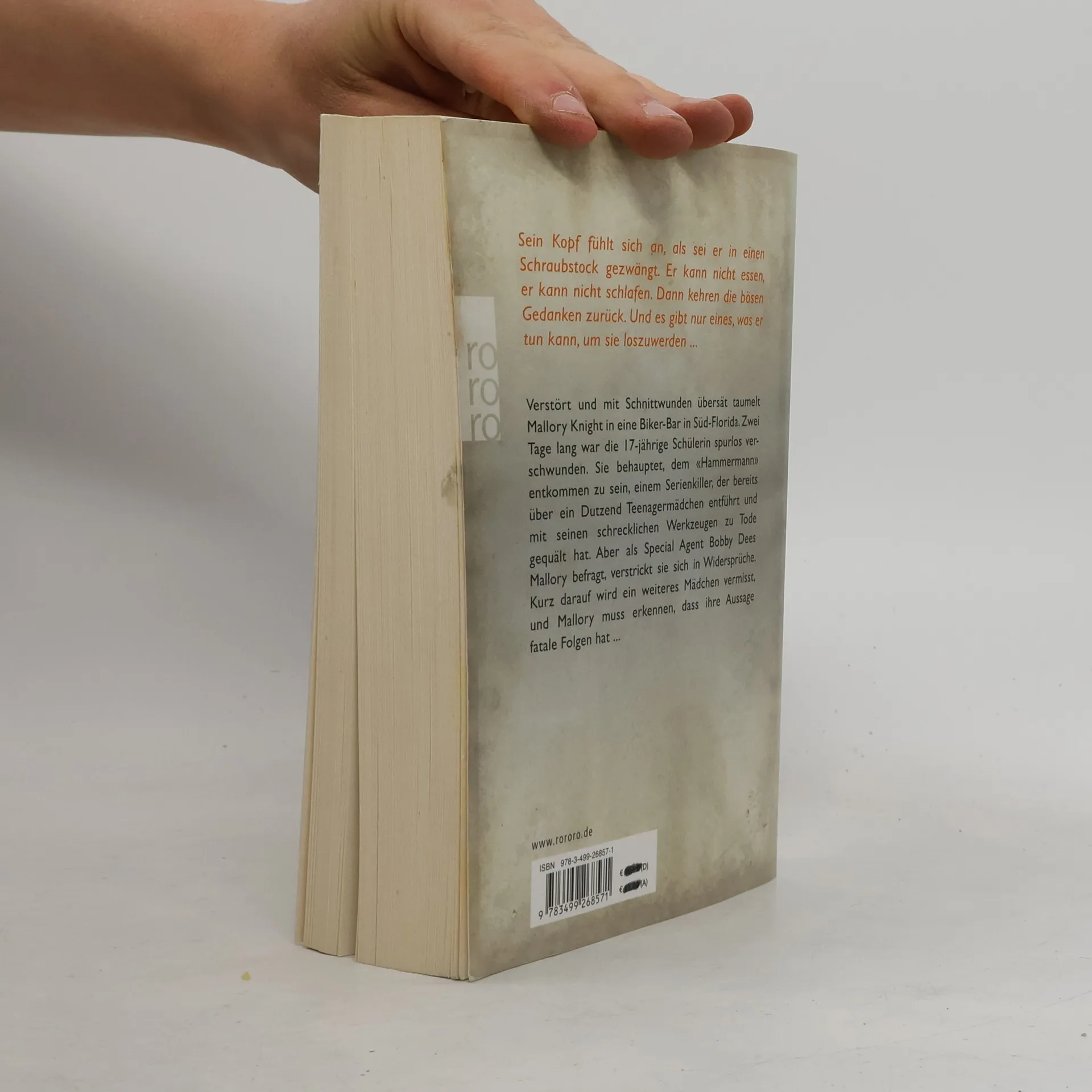 Sein Kopf fühlt sich an, als sei er in einen Schraubstock gezwängt. Er kann nicht essen, er kann nicht schlafen. Dann kehren die bösen Gedanken zurück. Und es gibt nur eines, was er tun kann, um sie loszuwerden ... Verstört und mit Schnittwunden übersät taumelt Mallory Knight in eine Biker-Bar in Süd-Florida. Zwei Tage lang war die 17-jährige Schülerin spurlos verschwunden. Sie behauptet, dem „Hammermann“ entkommen zu sein, einem Serienkiller, der bereits über ein Dutzend Teenagermädchen entführt und mit seinen schrecklichen Werkzeugen zu Tode gequält hat. Aber als Special Agent Bobby Dees Mallory befragt, verstrickt sie sich in Widersprüche. Kurz darauf wird ein weiteres Mädchen vermisst, und Mallory muss erkennen, dass ihre Aussage fatale Folgen hat ...