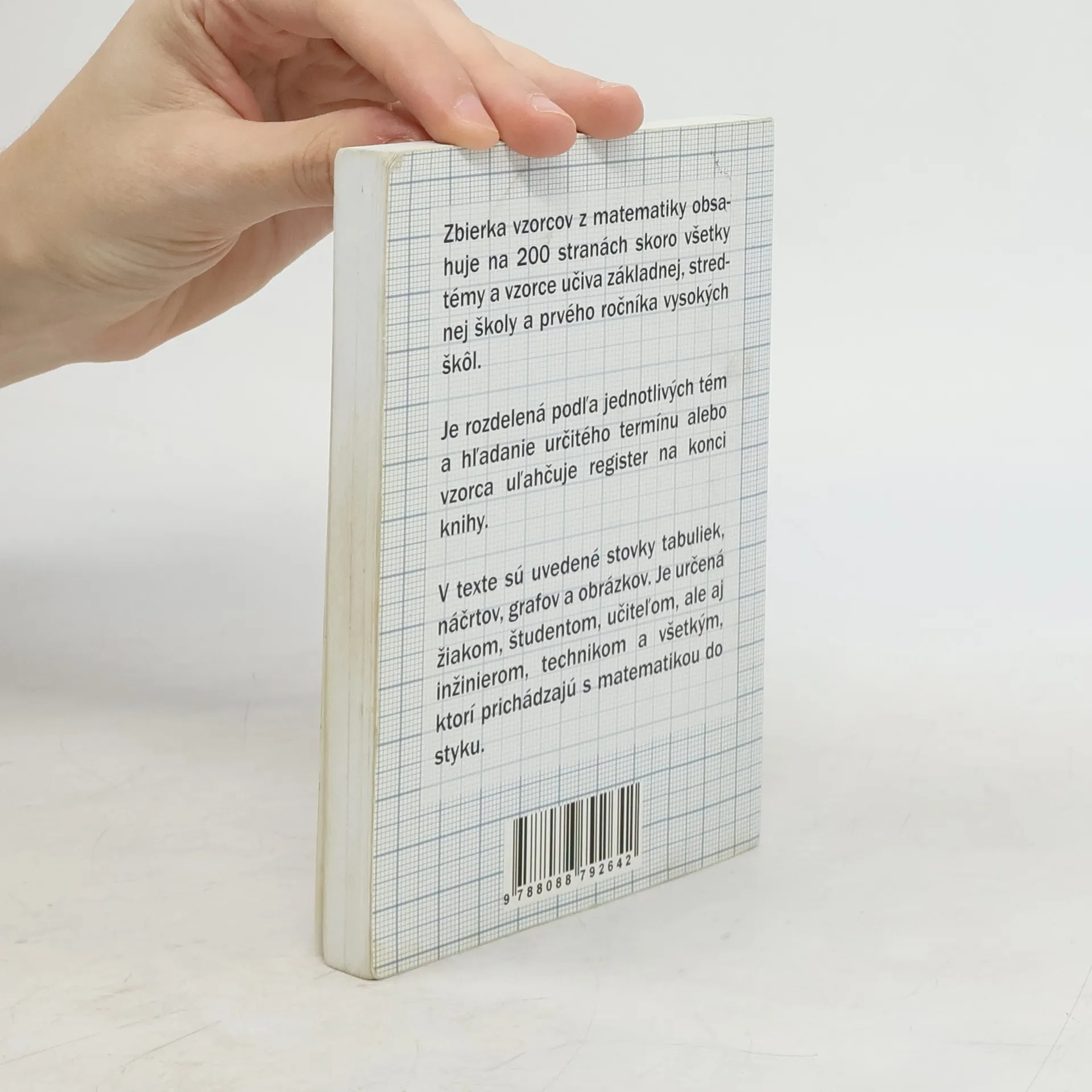 Zbierka vzorcov z matematiky obsahuje na 200 stranách textu skoro všetky témy a vzorce učiva základnej a strednej školy a prvého ročníka vysokých škôl. Je rozdelená podľa jednotlivých tém a hľadanie určitého, termínu alebo vzorca uľahčuje register na konci knihy. V texte sú uvedené stovky tabuliek, náčrtov, grafov a obrázkov. Je určená žiakom, študentom, učiteľom ale aj inžinierom, technikom a všetkým, ktorí prichádzajú s matematikou do styku. 2. vydanie