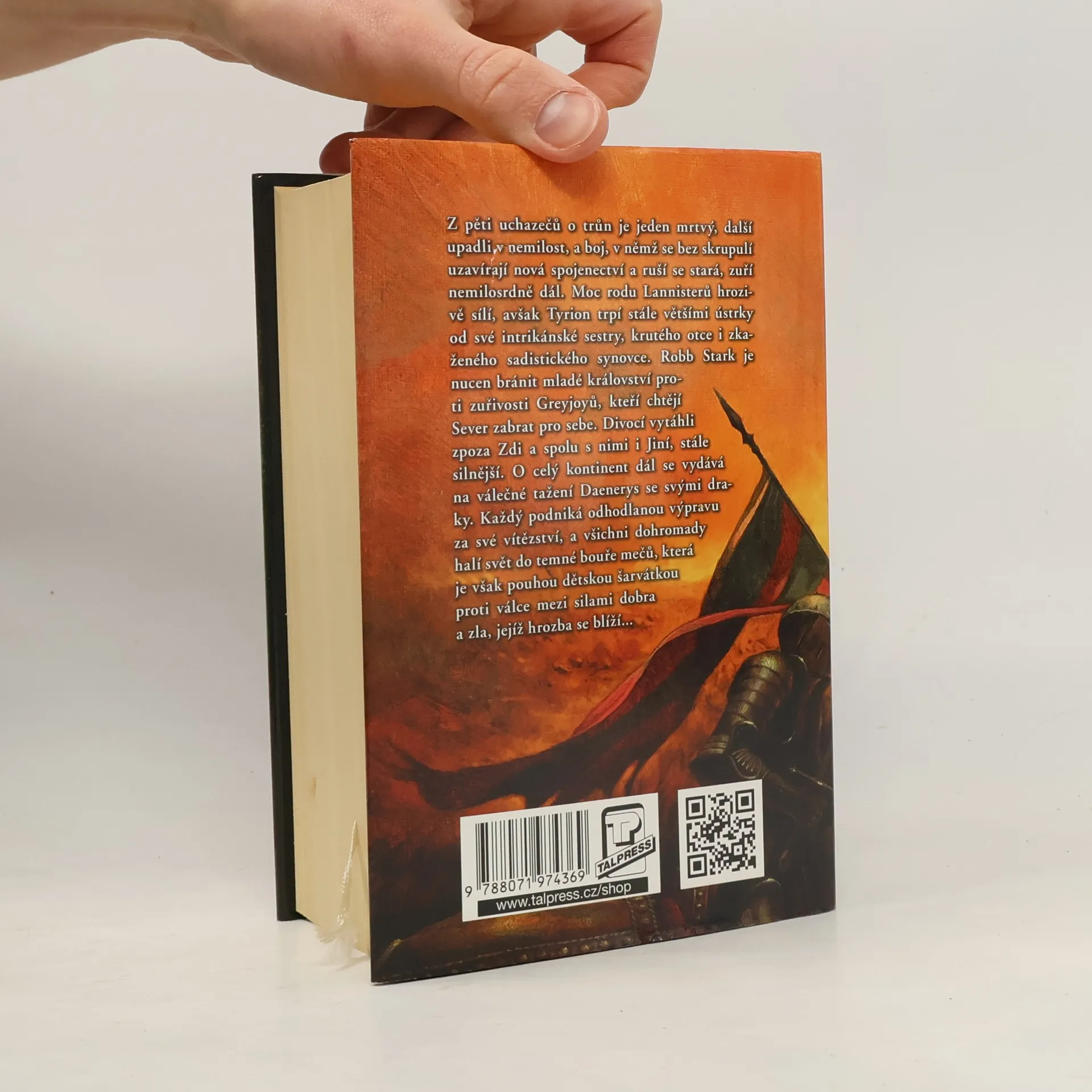 Z pěti uchazečů o trůn je jeden mrtvý, další upadli v nemilost, a boj, v němž jsou bez skrupulí uzavírána nová spojenectví a rušena stará, zuří nemilosrdně dál. Moc rodu Lannisterů hrozivě sílí, avšak Tyrion trpí stále většími ústrky od své intrikánské sestry, krutého otce i zkaženého sadistického synovce. Robb Stark je nucen bránit mladé království proti zuřivosti Greyjoyů, kteří si chtějí Sever zabrat pro sebe. Divocí vytáhli zpoza Zdi a spolu s nimi nabývají na síle Jiní. O celý kontinent dál se vydává na válečné tažení Daenerys a její draci nebezpečně rostou.Každý podniká odhodlanou výpravu za své vítězství, a všichni dohromady halí svět do temné bouře mečů, která je však pouhou dětskou šarvátkou ve srovnání s válkou mezi silami dobra a zla, jejíž hrozba se blíží…