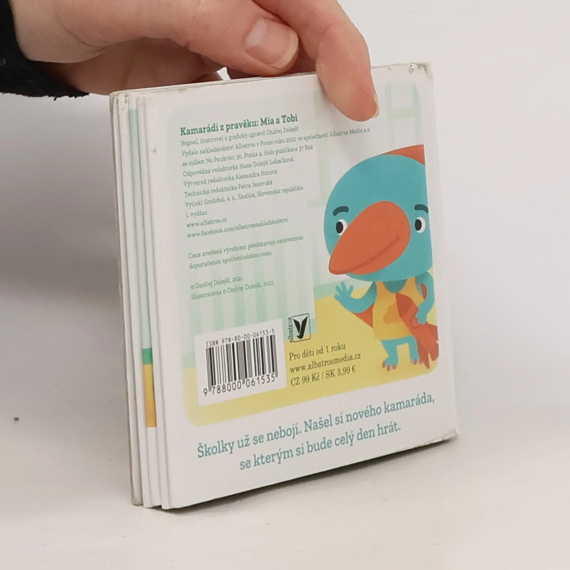 Tobi jde poprvé do školky a stydí se. Mia je na pískovišti, nejde jí udělat bábovka, a moc se zlobí. Malí dinosauři zažívají stejné problémy a situace, s nimiž se musí čas od času popasovat i všechna lidská mláďata: bojí se, stydí se, jsou smutné, cítí vztek anebo se jim třeba vůbec nic nechce. První ze série autorských leporel Kamarádi z pravěku o emocích a sociálních interakcích. Pro děti od 1 roku.