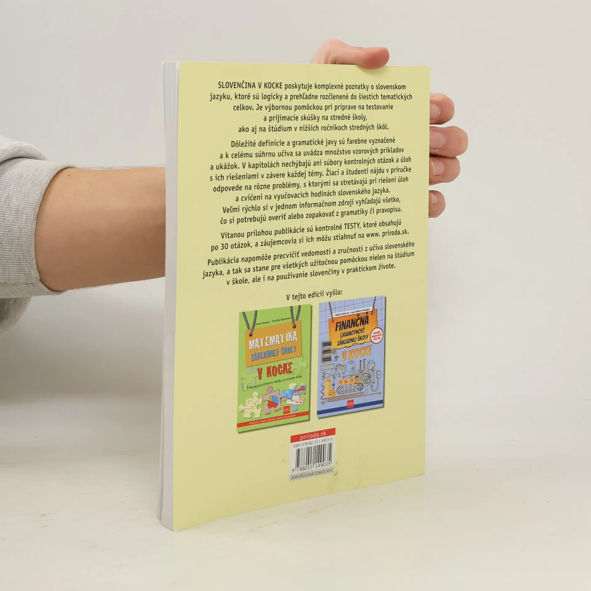Publikácia predstavuje ucelený prehľad učiva zo slovenského jazyka v rámci základnej školy a nižších ročníkov gymnázií aj stredných škôl. Dôležité definície a gramatické javy sú farebne vyznačené a k učivu sa uvádzajú vzorové príklady a ukážky. Kapitoly obsahujú aj kontrolné otázky, úlohy a ich riešenia v závere každej témy. Praktickou prílohou sú Testy s otázkami, ktoré si žiaci a učitelia môžu stiahnuť na www.priroda.sk.