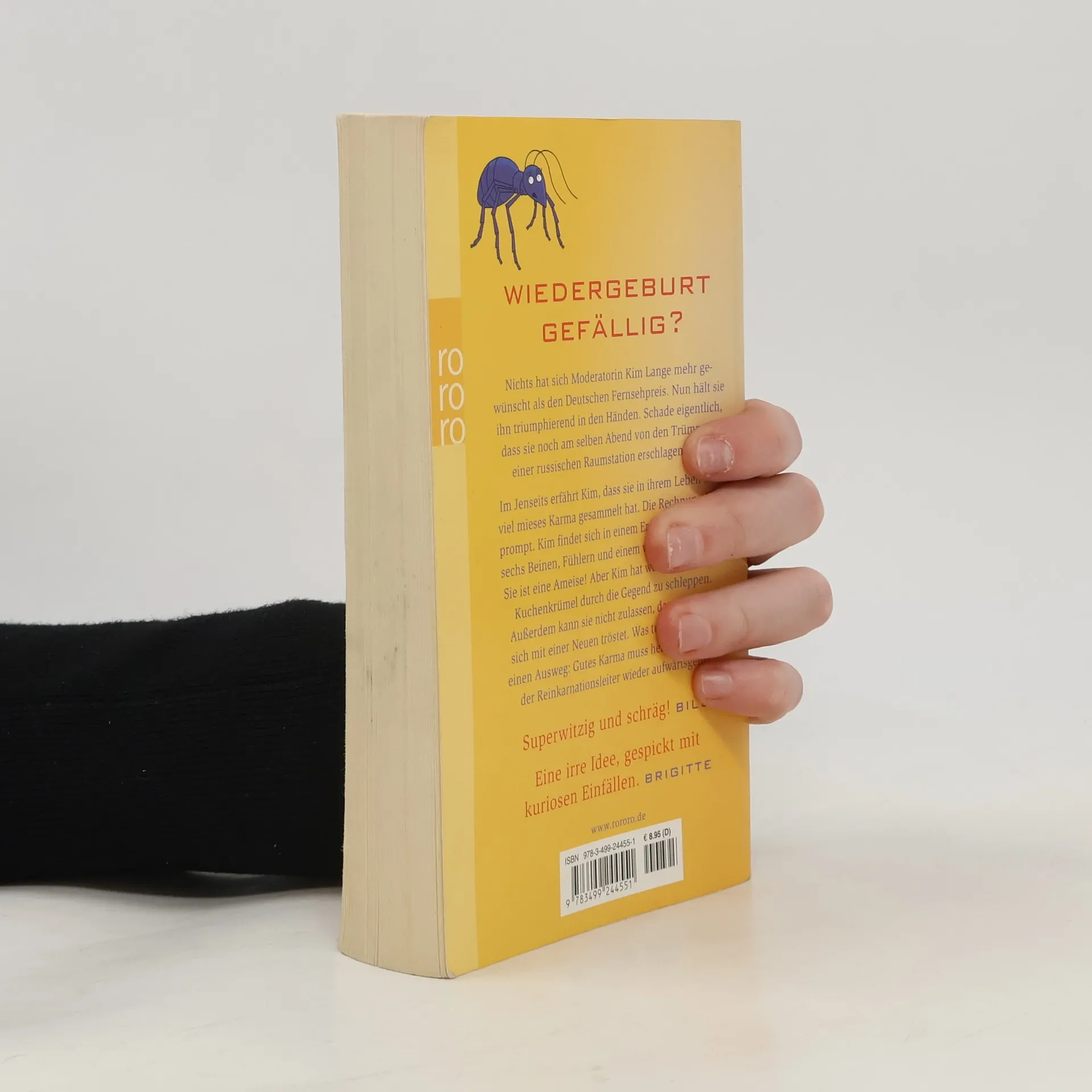 Wiedergeburt gefällig? Nichts hat sich Moderatorin Kim Lange mehr gewünscht als den deutschen Fernsehpreis. Nun hält sie ihn triumphierend in den Händen. Schade eigentlich, dass sie noch am selben Abend von den Trümmern einer russischen Raumstation erschlagen wird.Im Jenseits erfährt Kim, dass sie in ihrem Leben sehr viel mieses Karma gesammelt hat. Die Rechnung folgt prompt. Kim findet sich in einem Erdloch wieder, mit sechs Beinen, Fühlern und einem wirklich dicken Po: Sie ist eine Ameise! Aber Kim hat wenig Lust, fortan Kuchenkrümel durch die Gegend zu schleppen. Außerdem kann sie nicht zulassen, dass ihr Mann sich mit einer Neuen tröstet. Was tun? Es gibt nur einen Ausweg: Gutes Karma muss her, damit es auf der Reinkarnationsleiter wieder aufwärts geht! «Superwitzig und schräg!» (Bild) «Eine irre Idee, gespickt mit kuriosen Einfällen.» (Brigitte)