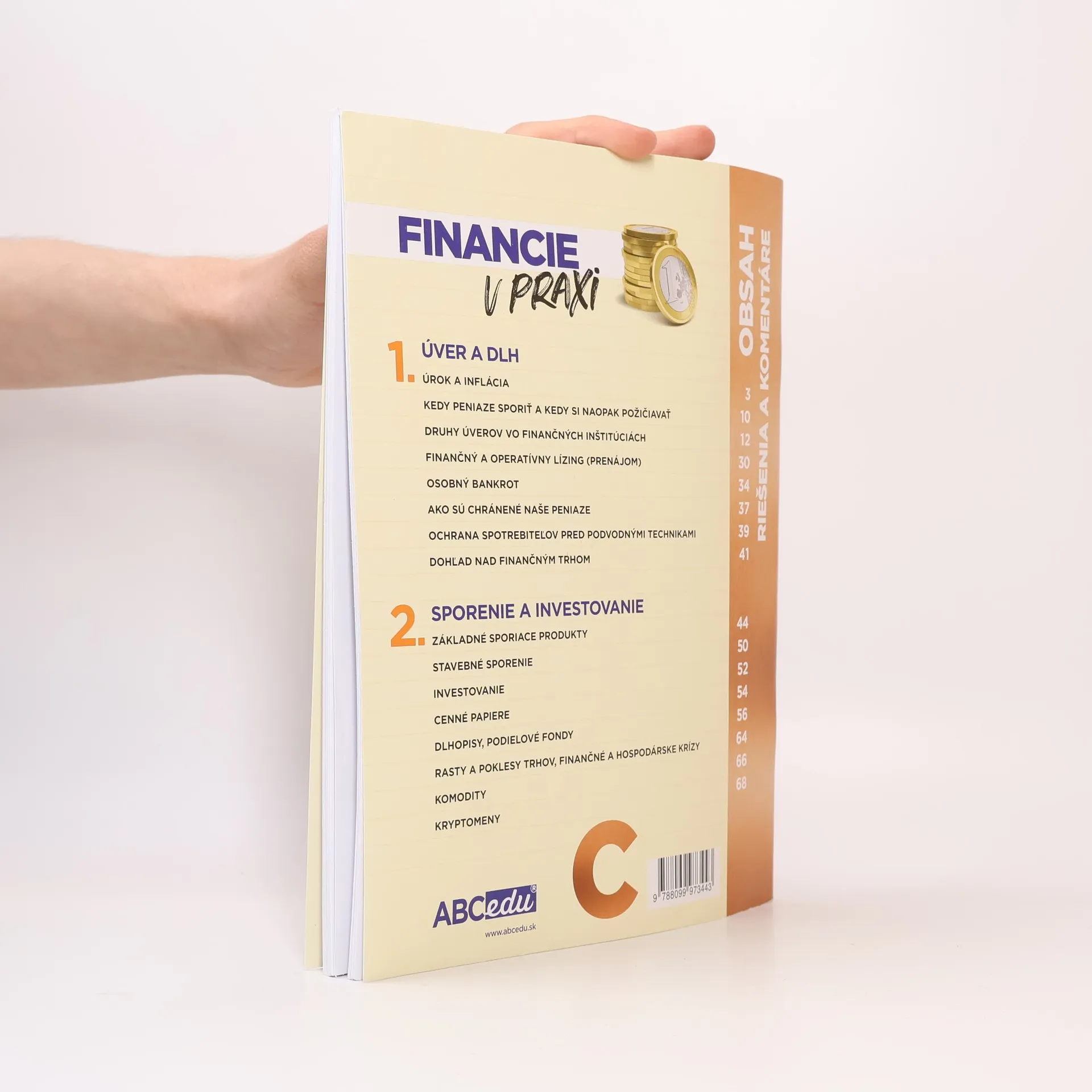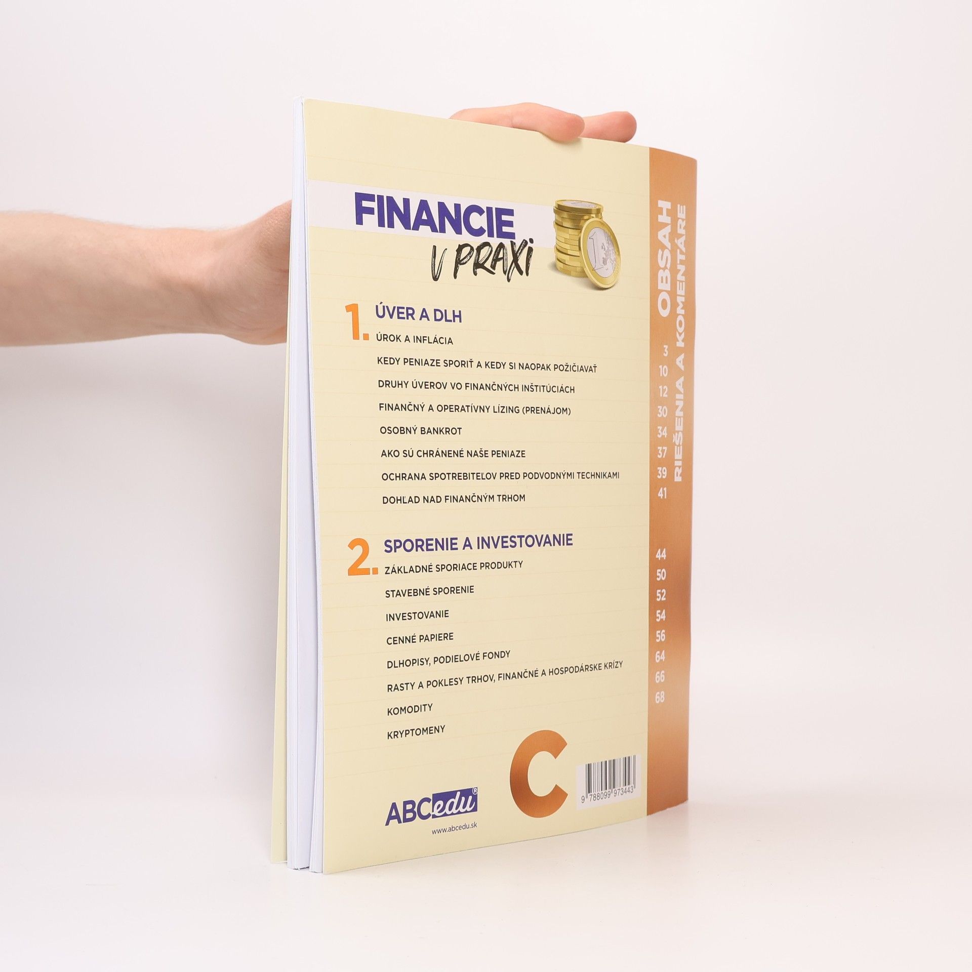 K pracovnej učebnici Financie v praxi C pripravili autori aj titul RIEŠENIA A KOMENTÁRE. Tento titul je určený nielen pre učiteľov, ktorí s pracovnou učebnicou pracujú v triede a má im šetriť čas potrebný na prípravu hodiny, ale aj pre nadšencov a fanúšikov vzdelávania v oblasti finančnej gramotnosti. Riešenia a komentáre okrem návrhov riešení jednotlivých zadaní poskytujú aj množstvo nápadov a podnetov na prácu s témami, ktorým sa pracovná učebnica venuje. Pracovná učebnica ponúka prehľadnou formou informácie, ktoré žiakovi pomáhajú porozumieť financiám a správne s nimi zaobchádzať pre finančné zabezpečenie seba, rodiny a svojej domácnosti. Pomáha chápať všetky kľúčové aspekty osobných financií, pričom na základoch, ktoré si takto študent osvojí, môže v budúcnosti ďalej rozvíjať svoje vedomosti s ohľadom na inovácie v oblasti bankovníctva a poisťovníctva, a zmeny v jeho postavení a príležitostiach. Učebnica koncipovaná v súlade so schváleným Návrhom stratégie vzdelávania vo finančnej oblasti a manažmentu osobných financií a prijatým Národným štandardom finančnej gramotnosti MŠVVaŠ SR. Pracovná učebnica C je zameraná na úver a dlh, sporenie a investovanie, finančné trhy a zabezpečenie sa voči existujúcim rizikám.