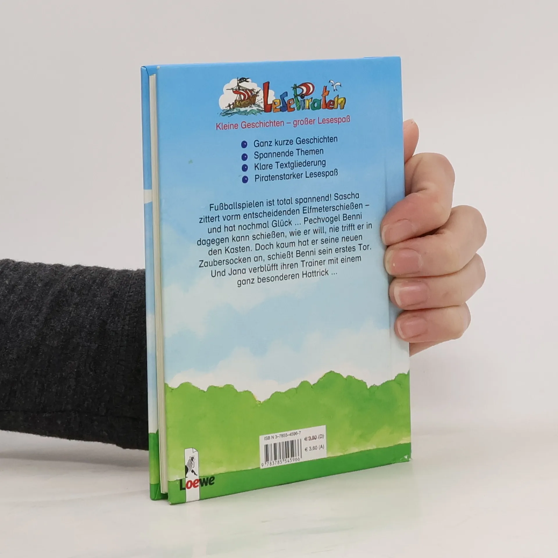 Lesealter ab 7 3. Stufe der Loewe-Leseleiter Ganz kurze Geschichten Einfache Textgliederung Fußballspielen ist total spannend! Sascha zittert vorm entscheidenden Elfmeterschießen - und hat noch mal Glück. Pechvogel Benni dagegen kann schießen, wie er will, nie trifft er in den Kasten. Doch kaum hat er seine neuen Zaubersocken an, schießt Benni sein erstes Tor. Und Jana verblüfft ihren Trainer mit einem ganz besonderen Hattrick