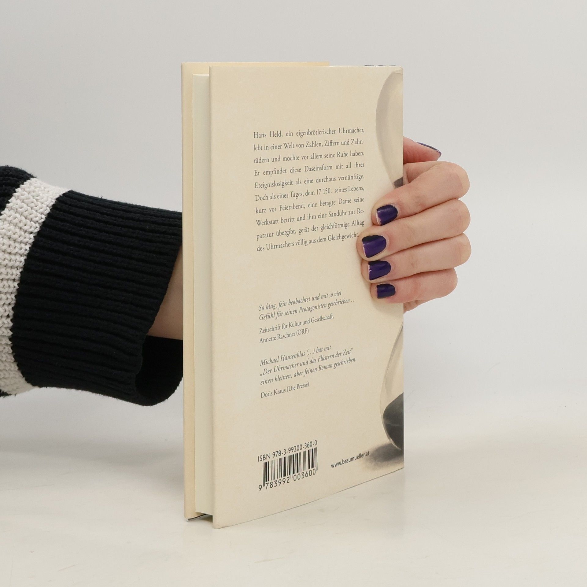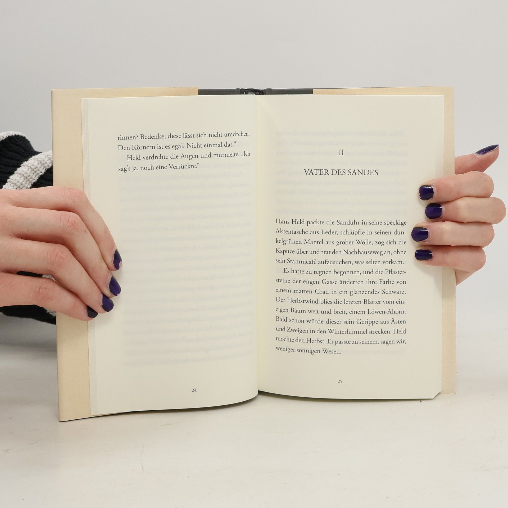 Hans Held, ein eigenbrötlerischer Uhrmacher, eingenommen von Zahlen, Ziffern und Zahnrädern, wünscht sich nichts mehr, als seine Ruhe zu haben. Schräubchen, Federn und Lünetten sind ihm die liebste Gesellschaft. Doch als eines Tages, dem 17150. Tag seines Lebens, kurz vor Feierabend, eine betagte Dame seine kleine Werkstatt betritt und ihm eine Sanduhr zur Reparatur übergibt, gerät die marottenhafte Eintönigkeit seines Daseins aus dem Gleichgewicht. Überfordert und verwirrt von dem Auftrag der Kundin, begibt er sich auf die Suche nach dem möglichen Gebrechen, kauft zu Studienzwecken diverse Sanduhren, lauscht dem Rieseln des Sandes und kommt mit so manchem Korn auf dubiose Art in Berührung. Nachdem er von ungeahnten Seiten und nach mysteriösen Begegnungen Hinweise erhält, bricht er zu einer Erkundungsreise in die Wüste auf, wo er dem Wesen der Zeit sehr nahekommt. "Wenn es so ist, dass wir nur einen kleinen Teil von dem leben können, was in uns ist – was geschieht mit dem Rest?" Pascal Mercier, Nachtzug nach Lissabon