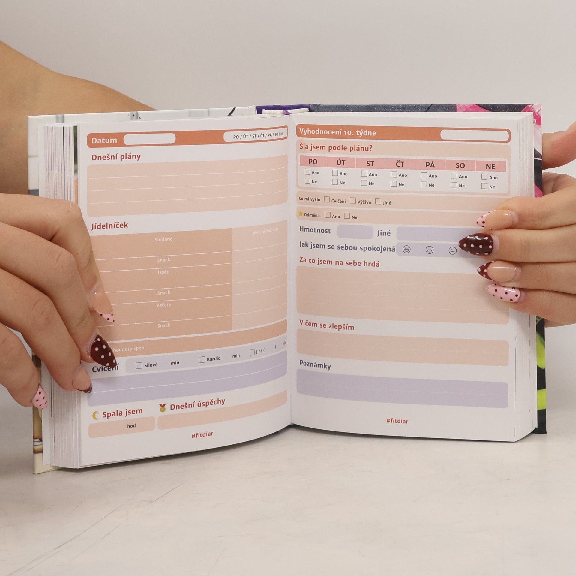 Myslíš to se svými cíli vážně? Fit diář ti pomůže s plánováním, monitorováním a vyhodnocováním tvé cesty k dosažení cílů. Pokud chceš zhubnout, jíst zdravěji nebo lépe plánovat, tento diář se stane tvým nejlepším společníkem. Nabízí denní prostor pro zápis jídelníčku, cvičení a aktivit. S Fit diářem si můžeš zapsat kroky a pokrok, zůstat motivovaná a dosáhnout svých cílů. Obsahuje tipy na úspěšné plánování, motivaci prostřednictvím odměn a sledování pokroku, a výzvy k novým aktivitám. Můžeš hodnotit své pokroky na týdenní a měsíční bázi a zjistit, co ve své rutině změnit. Začít můžeš kdykoli, protože si data zapisuješ sama, což ti umožní využít všechny stránky. Fit diář také nabízí zdravé recepty s nutričními hodnotami, týdenní fit tipy a denní monitorování spánku a úspěchů. Obsahuje články a rady pro zdravý životní styl a interaktivní QR kódy pro recepty. Jeho praktický formát ti umožní mít diář stále při sobě, a navíc obsahuje komunitní podporu na sociálních sítích. Zapisování na papír je prokazatelně účinnější než digitální metody, což zvyšuje pravděpodobnost, že diář skutečně využiješ.