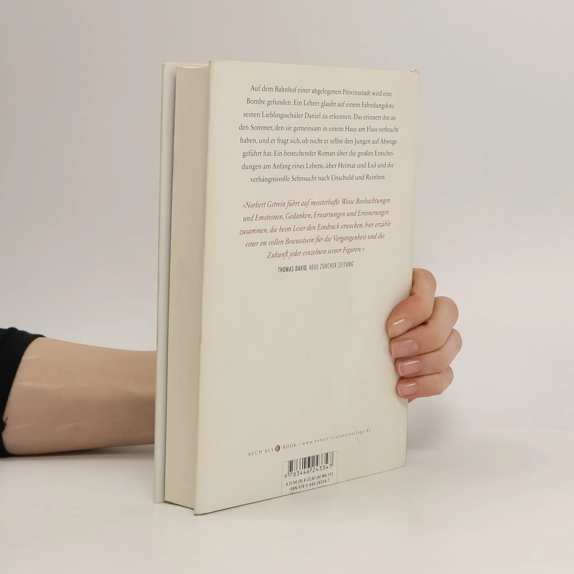 Auf dem Bahnhof in einer abgelegenen Provinzstadt wird eine Bombe gefunden. Ein Lehrer glaubt auf einem Fahndungsfoto seinen Lieblingsschüler Daniel zu erkennen, der sich nach einer Israel-Reise in religiöse und politische Phantastereien verrennt. Ist Daniel dem amerikanischen Endzeitprediger verfallen, der eines Tages in ihrem Ort aufgetaucht war und dann nach Jerusalem ging? Oder hat ein gemeinsamer Sommer den Jungen auf Abwege geführt, als der Lehrer und Daniel ganze Tage außerhalb der Zeit verbrachten? Mit seinem bewegenden und spannenden Roman ist Norbert Gstrein auf der Höhe seiner Kunst: ein Roman über Heimat und Exil und über die verhängnisvolle Sehnsucht nach Unschuld und Reinheit.