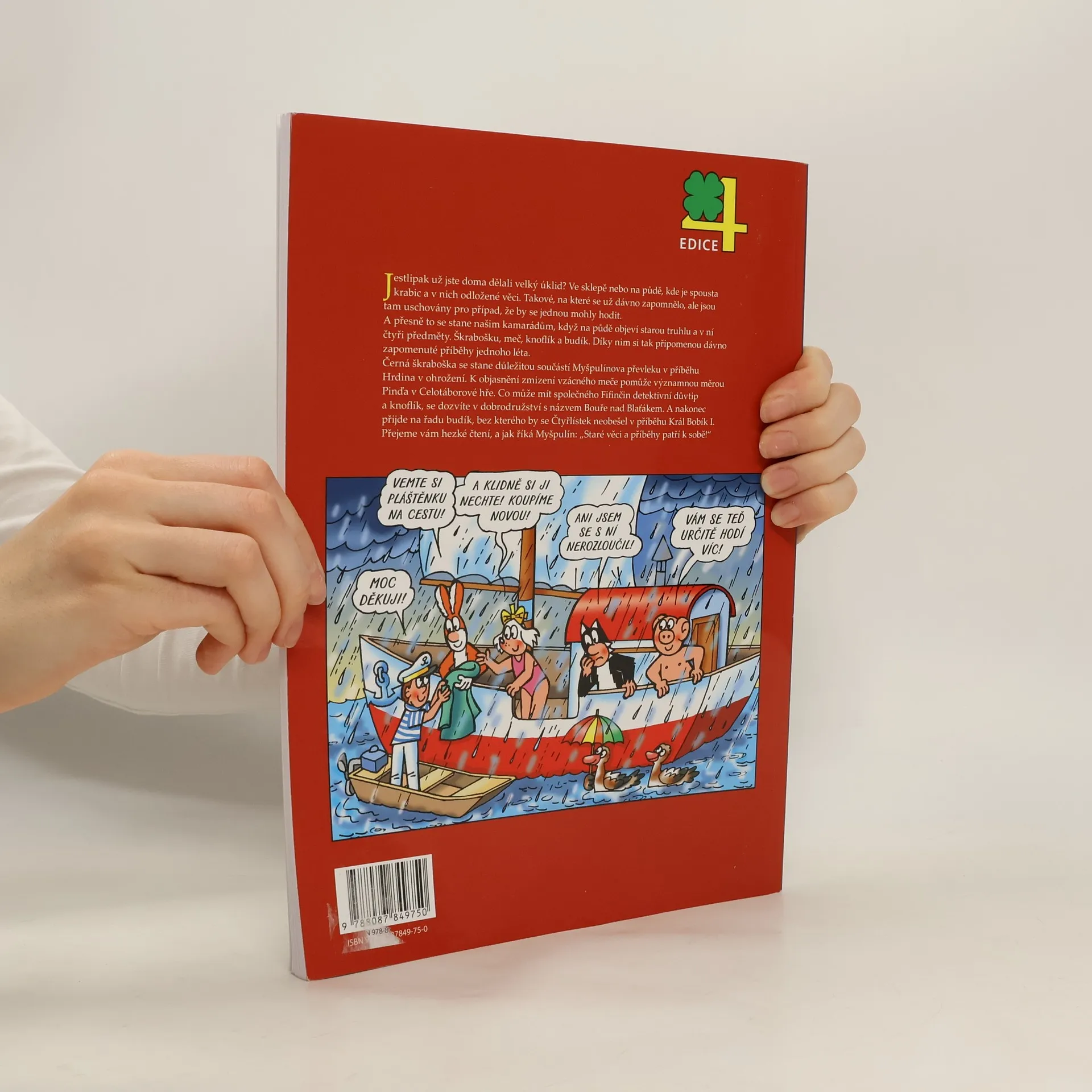 Další čtyři dobrodružství party ze Čtyřlístku. Tentokrát čtveřice objevila na půdě zapomenutou truhlu plnou vzpomínek na dobrodružné léto. Půda je plná haraburdí, nejvyšší čas pustit se do úklidu. Pod vrstvami prachu Myšpulín objeví starou truhlu plnou nesourodých věcí. Co to jen může být? Kamarádi si ale brzo vzpomenou a o knoflíku, meči, budíku a škrabošce budou vyprávět ve čtyřech zapomenutých příbězích.