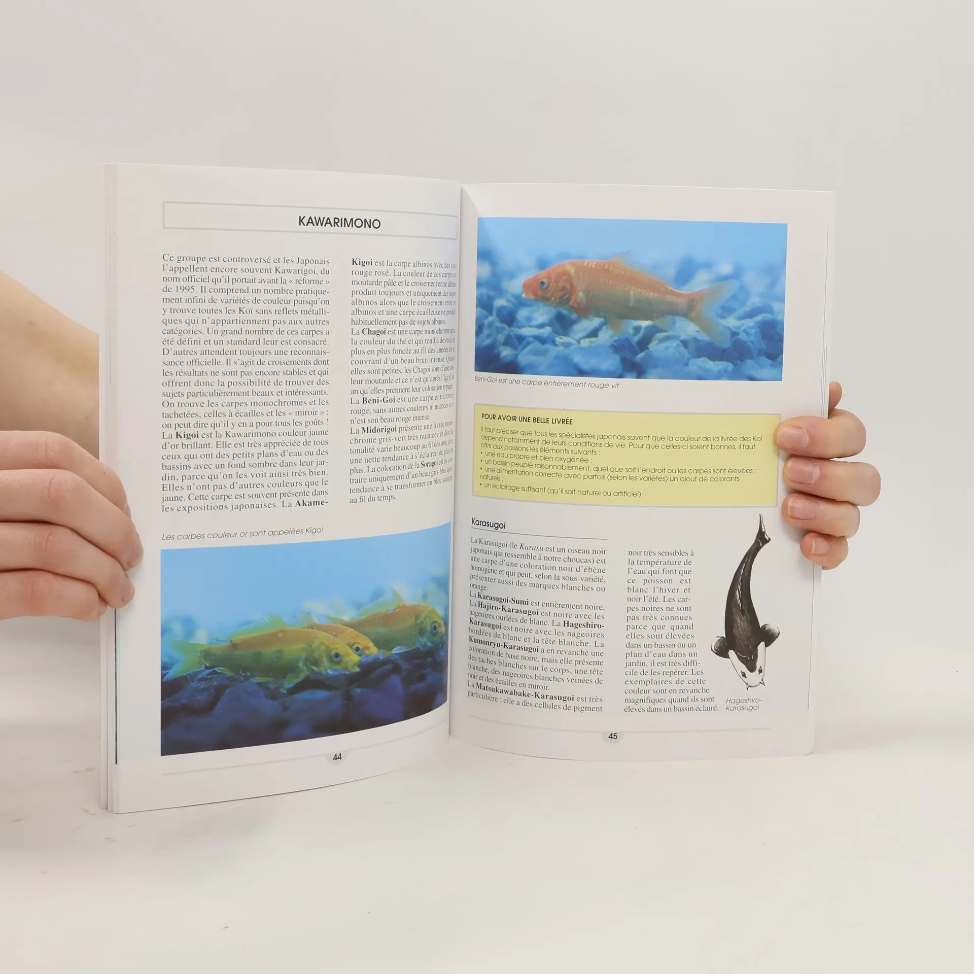 Superbe poisson exotique, la carpe Koï fait le bonheur des amateurs de bassins aquatiques. Il en existe plusieurs dizaines d'espèces, et les couleurs varient d'un sujet à l'autre. D'une grande vivacité mais aussi d'une grande taille, les carpes Koï sont d'un effet ornemental assuré.L'auteur, fort de son expérience, nous fait découvrir les origines et l'histoire des capres Koï. Comment choisir un sujet sain, le type d'aquarium ou de bassin le plus adapté, comment lui offrir une alimentation correcte et des conditions environnementales propices à la reproduction, comment identifier les symptômes des principales maladies, comment les soigner.Vous trouverez dans cet ouvrage illustré tout en couleurs de nombreux conseils pratiques et des suggestions astucieuses pour permettre à vos carpes Koï de vivre heureuses et plus longtemps.