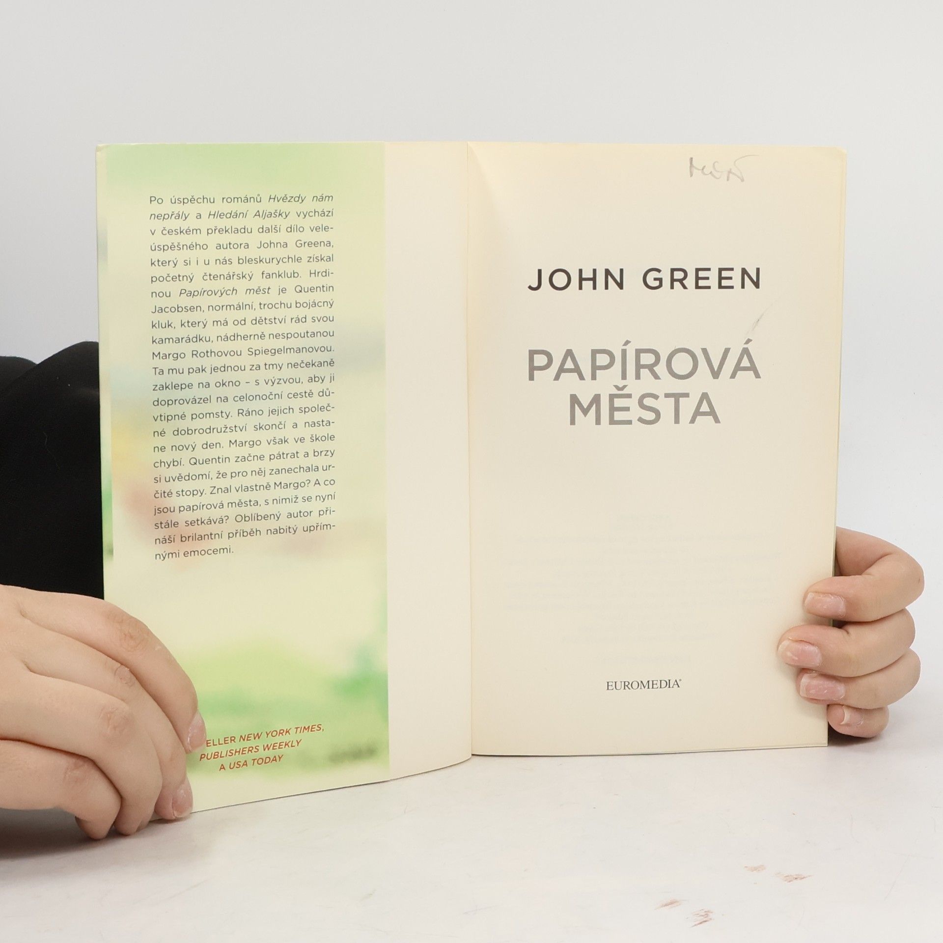 Po úspěchu románů Hvězdy nám nepřály a Hledání Aljašky vychází nyní v českém překladu další dílo veleúspěšného autora Johna Greena, který si i u nás bleskurychle získal početný fanklub. Hrdinou je Quentin Jacobsen, normální, tak trochu bojácný kluk, který má od dětství rád nespoutanou Margo. Ta mu pak jednoho dne nečekaně zaklepe na okno a vtáhne ho do podivuhodného dobrodružství. Když dívka další dny ve škole chybí, Quentin začne pátrat a brzy si uvědomí, že pro něj zanechala určité stopy. Znal vlastně Margo? A co jsou papírová města, s nimiž se nyní stále setkává? Oblíbený autor přináší brilantní příběh nabitý upřímnými emocemi, který nenechá čtenáře chladným.