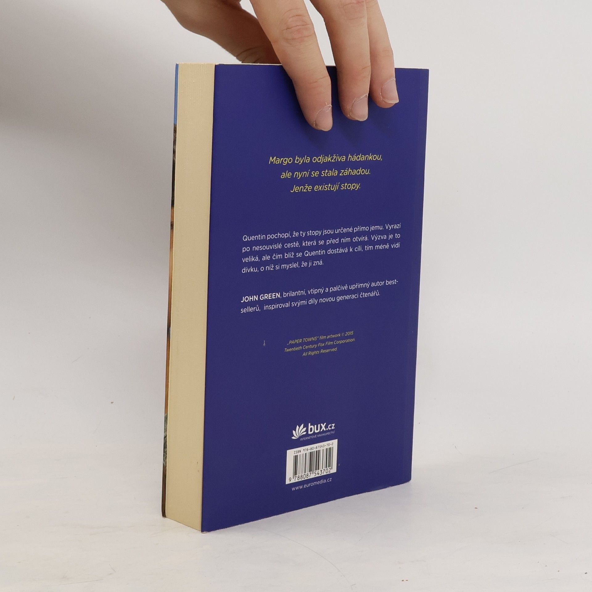 Po úspěchu románů Hvězdy nám nepřály a Hledání Aljašky vychází nyní v českém překladu další dílo veleúspěšného autora Johna Greena, který si i u nás bleskurychle získal početný fanklub. Hrdinou je Quentin Jacobsen, normální, tak trochu bojácný kluk, který má od dětství rád nespoutanou Margo. Ta mu pak jednoho dne nečekaně zaklepe na okno a vtáhne ho do podivuhodného dobrodružství. Když dívka další dny ve škole chybí, Quentin začne pátrat a brzy si uvědomí, že pro něj zanechala určité stopy. Znal vlastně Margo? A co jsou papírová města, s nimiž se nyní stále setkává? Oblíbený autor přináší brilantní příběh nabitý upřímnými emocemi, který nenechá čtenáře chladným.