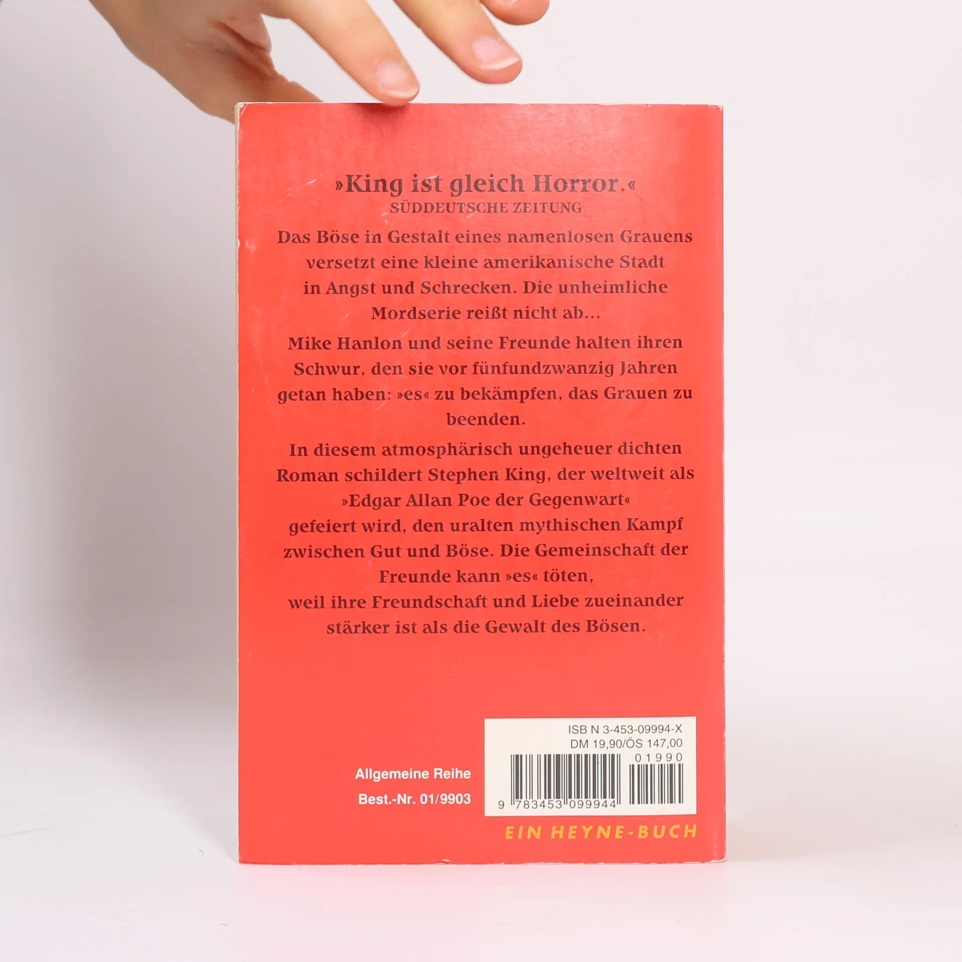1957 hatte alles begonnen. Der kleine Georgie war das erste Opfer. Und dann brach "es" über die Stadt Derry herein. Über 25 Jahre später: Mike Hanlon ruft sechs Freunde zusammen und erinnert sie an den Schwur, den sie geleistet haben. Sollte "es", das namenlose Böse, noch einmal auftauchen, wollen sie sich wieder in Derry treffen. Damals sind die Freunde in Abwasserschächte gestiegen, als Kinder haben sie "es" gejagt und zu töten versucht. Aber "es" wurde nur verletzt. Einer der Freunde kann zum Treffen nicht mehr kommen. Er liegt blutverschmiert in seiner Badewanne. Offensichtlich Selbstmord ...