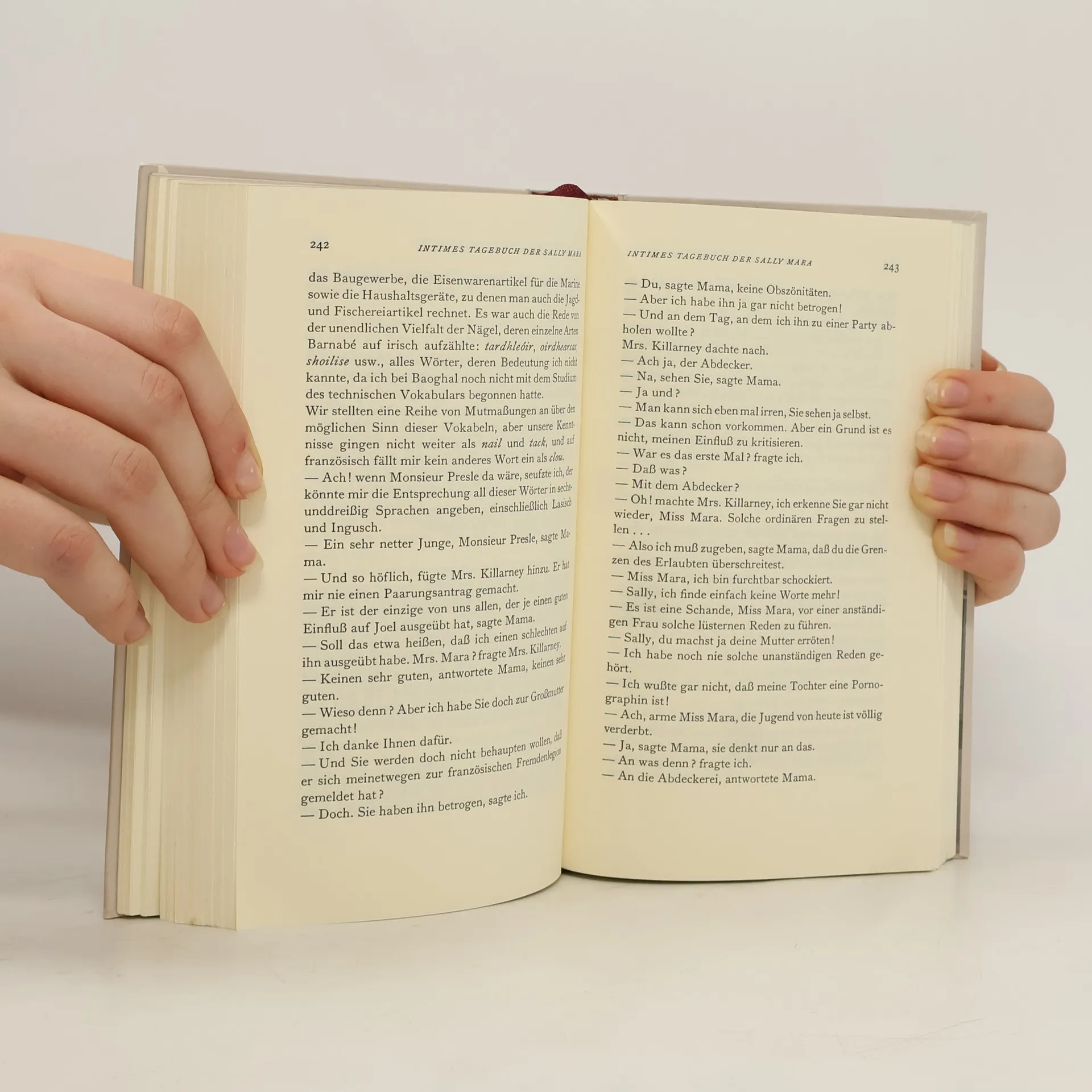 Sally Maras Vater ging beim Streichholzkauf verloren, ihre Mutter glaubt, die Kinder kämen vom Heiraten, Joel, ihr Bruder, säuft wie ein Loch. Stets sagt die gelehrige Sprachschülerin Sally das Unpassende und trifft so meist den Nagel (und andere Dinge) auf den Kopf. Mitglied diverser irischer Wrestlingverbände, verprügelt sie mit Vorliebe den Museumswärter und leckt begierig an Herkules' Alabasterwaden. Dem Geheimnis der sich fortpflanzenden Tierwelt dicht auf den Fersen, versucht sie immer "schön bei der Stange zu bleiben".§
