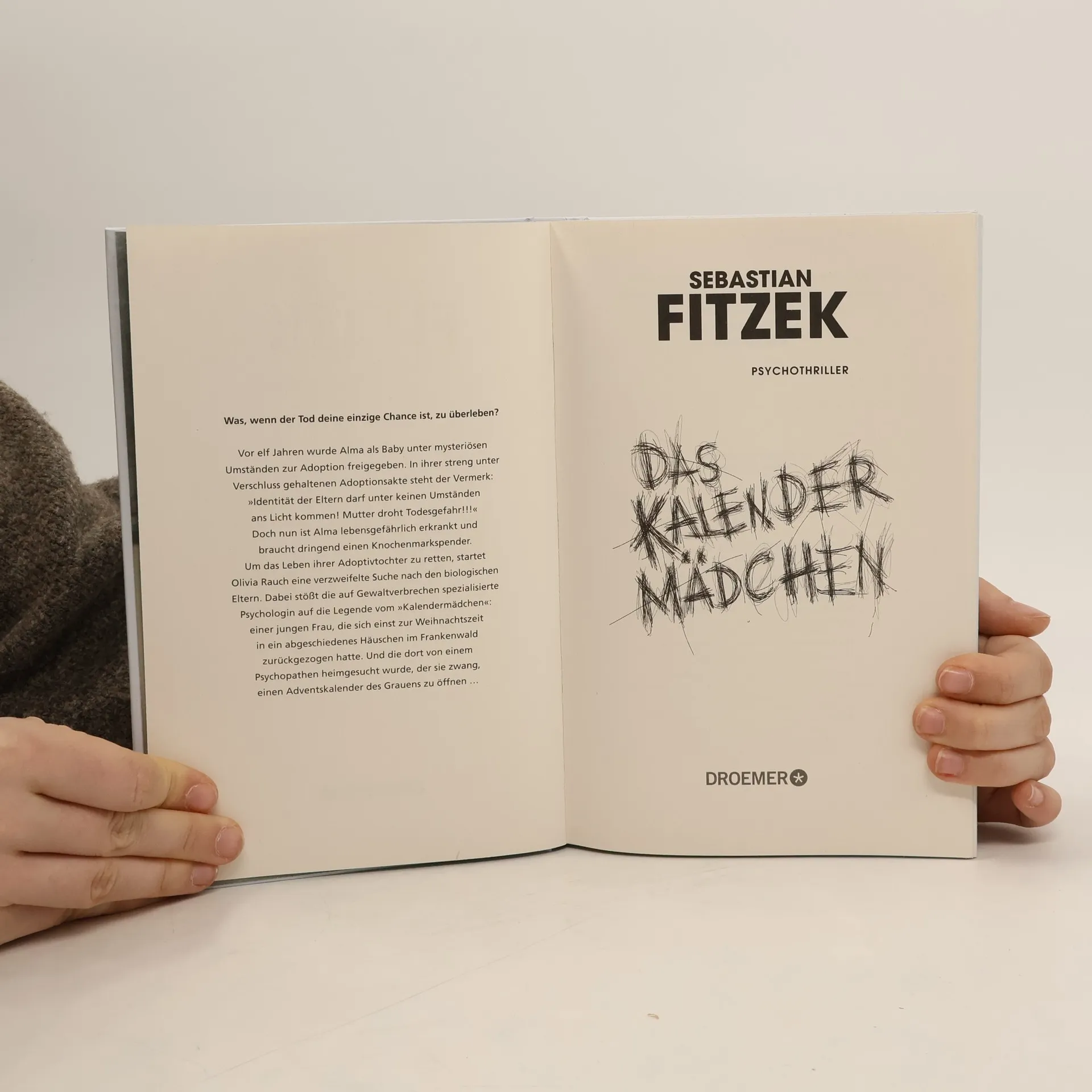 In "Das Kalendermädchen" von Sebastian Fitzek wird Alma, die als Baby zur Adoption freigegeben wurde, lebensgefährlich krank. Ihre Adoptivmutter Olivia sucht verzweifelt nach ihren biologischen Eltern, während sie auf die unheimliche Legende des "Kalendermädchens" stößt. Ein spannender Psychothriller, der auf drei Zeitebenen spielt.