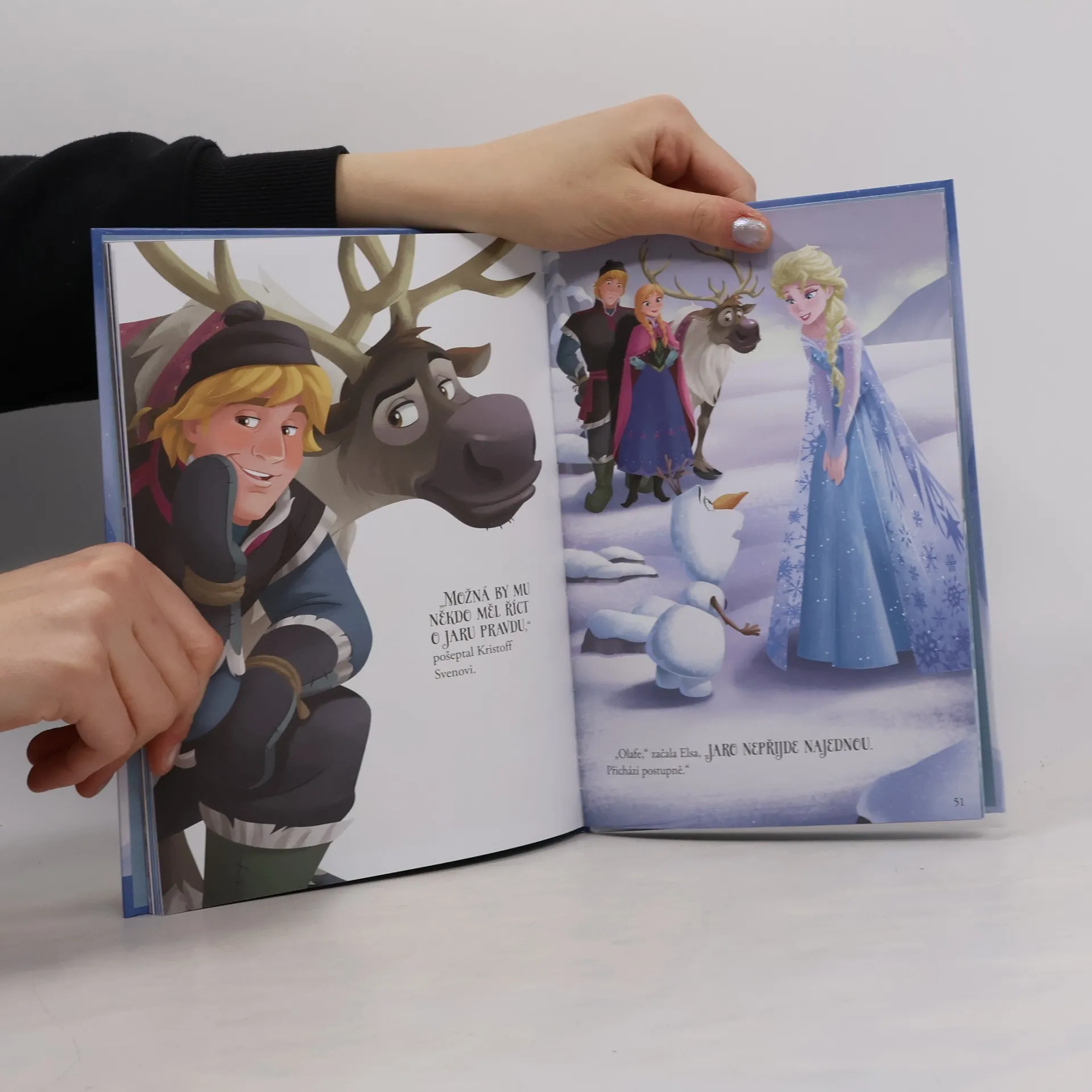 Oblíbení hrdinové z filmu ve dvou příbězích s celostránkovými ilustracemi. Dva příběhy s Annou, Elsou a jejich kamarádem Olafem. V prvním se blíží Vánoce, první, které po dlouhé době stráví Anna s Elsou konečně zase spolu. Olaf se pro ně pokusí sehnat nějaké pěkné rodinné tradice. Ve druhém příběhu se malý sněhulák, který tak moc miluje léto, dozví, proč je i jaro úžasné. Nakladatelská anotace.