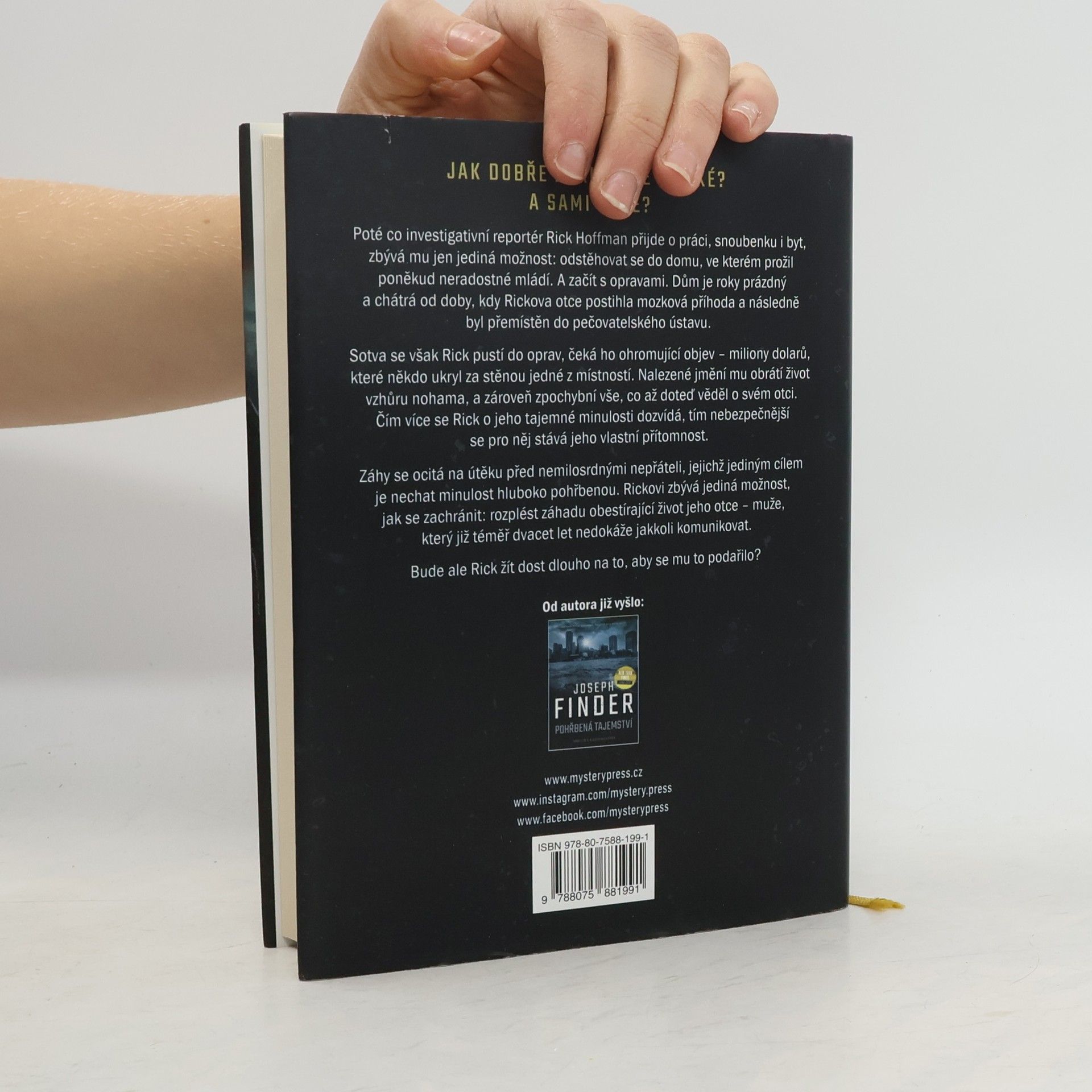 MILIONY NALEZENÉ VE STARÉM DOMĚ ODKRYJÍ TEMNÉ RODINNÉ TAJEMSTVÍ… Poté co investigativní reportér Rick Hoffman přijde o práci, snoubenku i byt, zbývá mu jen jediná možnost: odstěhovat se do domu, ve kterém prožil poněkud neradostné mládí. A začít s opravami. Dům je roky prázdný a chátrá od doby, kdy Rickova otce postihla mozková příhoda a následně byl přemístěn do pečovatelského ústavu. Sotva se však Rick pustí do oprav, čeká ho ohromující objev – miliony dolarů, které někdo ukryl za stěnou jedné z místností. Nalezené jmění mu obrátí život vzhůru nohama, a zároveň zpochybní vše, co až doteď věděl o svém otci. Čím více se Rick o jeho tajemné minulosti dozvídá, tím nebezpečnější se pro něj stává jeho vlastní přítomnost. Záhy se ocitá na útěku před nemilosrdnými nepřáteli, jejichž jediným cílem je nechat minulost hluboko pohřbenou. Rickovi zbývá jediná možnost, jak se zachránit: rozplést záhadu obestírající život jeho otce – muže, který již téměř dvacet let nedokáže jakkoli komunikovat. Bude ale Rick žít dost dlouho na to, aby se mu to podařilo?