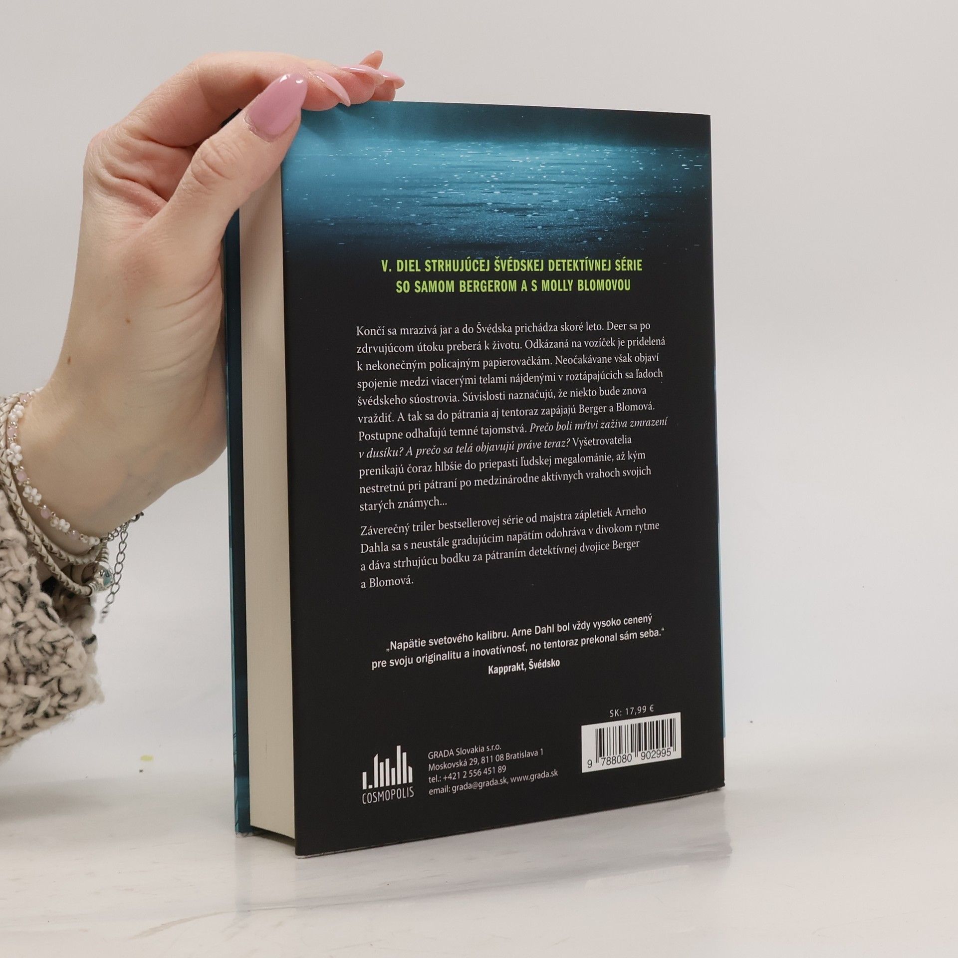 Končí sa mrazivá jar a do Švédska prichádza skoré leto. Deer sa po zdrvujúcom útoku preberá k životu. Odkázaná na vozíček je pridelená k nekonečným policajným papierovačkám. Neočakávane však objaví spojenie medzi viacerými telami nájdenými v roztápajúcich sa ľadoch švédskeho súostrovia. Súvislosti naznačujú, že niekto bude znova vraždiť. A tak sa do pátrania aj tentoraz zapájajú Berger a Blomová. Postupne odhaľujú temné tajomstvá. Prečo boli mŕtvi zaživa zmrazení v dusíku? A prečo sa telá objavujú práve teraz? Vyšetrovatelia prenikajú čoraz hlbšie do priepasti ľudskej megalománie, až kým nestretnú pri pátraní po medzinárodne aktívnych vrahoch svojich starých známych... Záverečný triler bestsellerovej série od majstra zápletiek Arneho Dahla sa s neustále gradujúcim napätím odohráva v divokom rytme a dáva strhujúcu bodku za pátraním detektívnej dvojice Berger a Blomová.