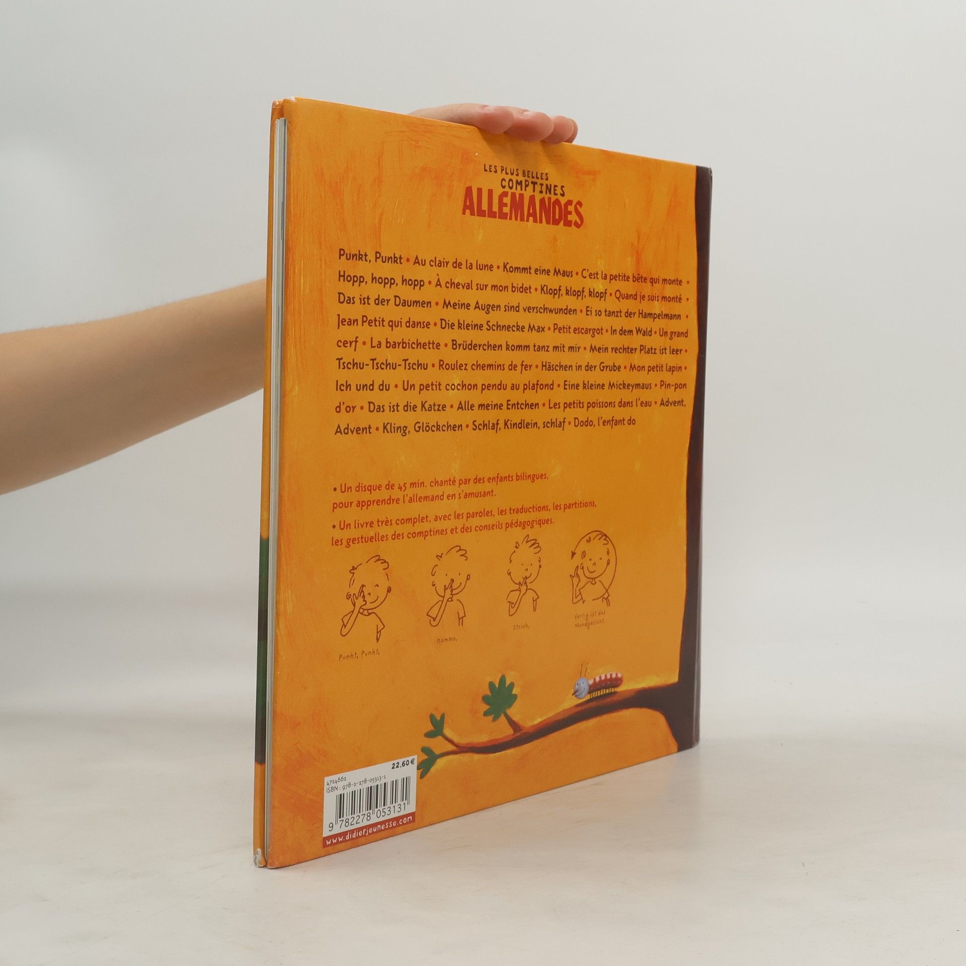 Des comptines bilingues pour faire chanter les langues aux oreilles des petits...Des pédagogues ont sélectionné des comptines très connues dans chaque langue et leurs équivalents français.Sur les CD, les voix des enfants sont fraîches et la musique entraînante.A la fin des ouvrages, on retrouve les gestuelles et les commentaires.