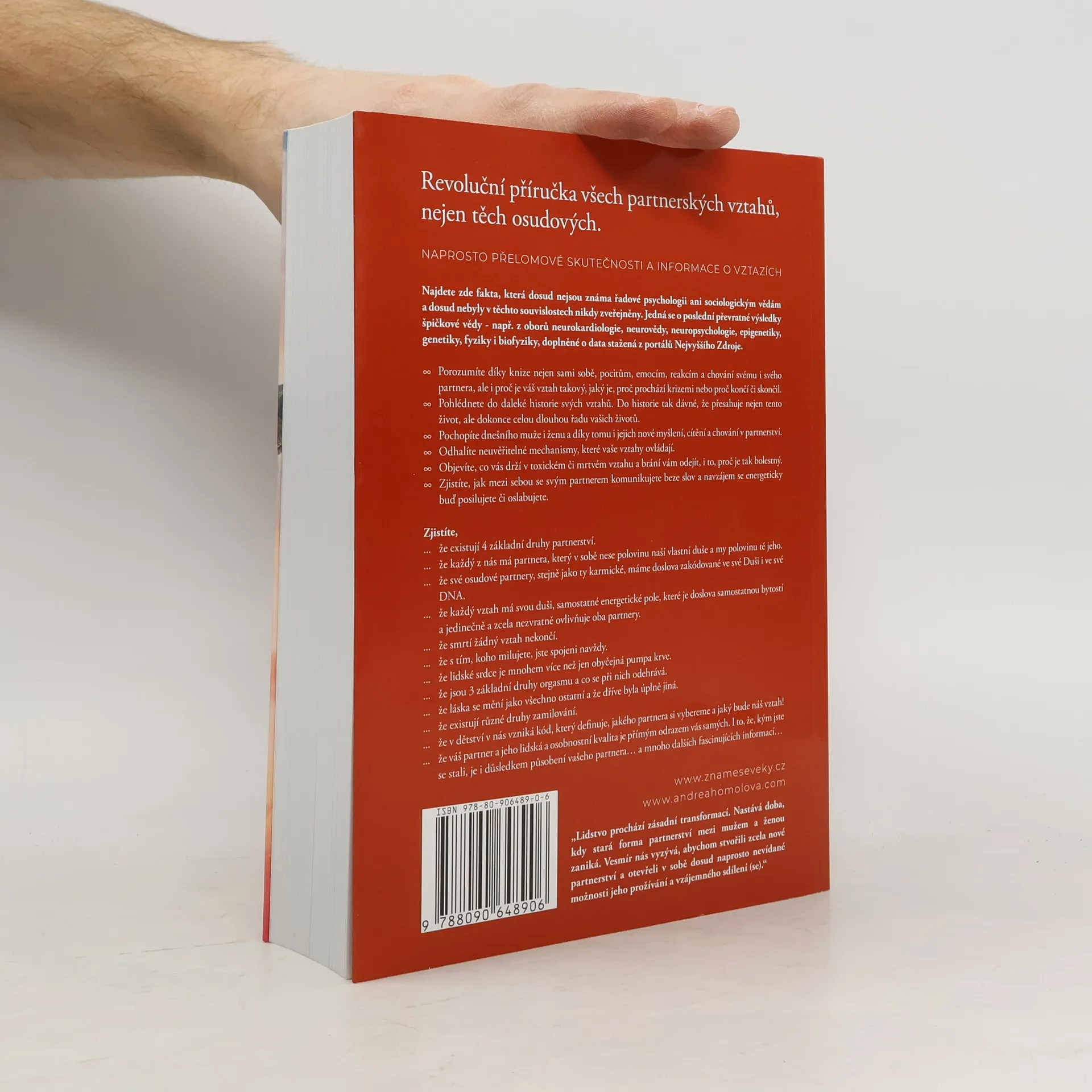 Kniha o vztazích, která změní váš život. Revoluční příručka všech partnerských vztahů, včetně těch osudových. Najdete zde naprosto přelomové skutečnosti a informace týkající se vztahů, fakta, která dosud nejsou známa řadové psychologii, ani sociologickým vědám, a dosud nebyla v těchto souvislostech nikdy zveřejněna. Jedná se nejen o poslední převratné výsledky špičkové světové vědy - např. z oborů neurokardiologie, neurovědy, neuropsychologie, epigenetiky, genetiky, fyziky a biofyziky, související se vztahy, ale i skutečnosti a souvislosti z duchovních věd. Kniha je výjimečná syntézou obou pramenů poznání a také tím, že vám zodpoví všechny otázky na téma partnerství, na které jste dosud hledali odpovědi, ale nenalezli je. Dozvíte se například, že DNA je neuroplastická, neboli že začínáme být schopni ji sami přepisovat svým vlastním vědomím. Že v DNA je uložen kód našich partnerů. Že žádný vztah nikdy neskončí, ani smrtí jednoho z partnerů. Že pouhou myšlenkou, i na vzdálenost tisíců kilometrů, ovlivňujeme tepovou frekvenci toho, na nějž s láskou pomyslíme a mnoho podobných převratných informací, které nebyly dosud zveřejněny v těchto souvislostech. Lze koupit na www.znameseveky.cz