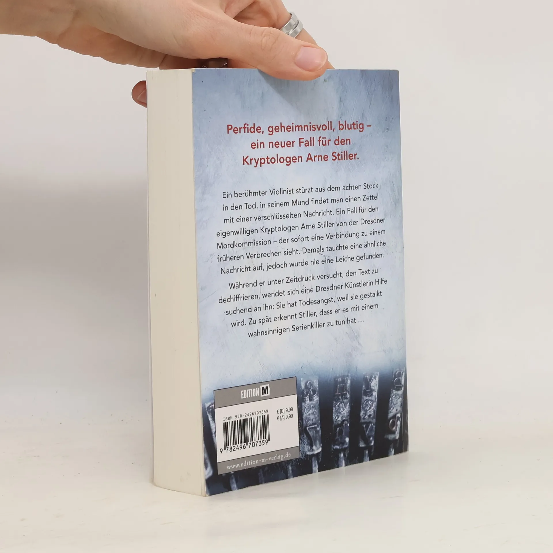 Perfide, geheimnisvoll, blutig – ein neuer Fall für den Kryptologen Arne Stiller. Ein berühmter Violinist stürzt aus dem achten Stock in den Tod, in seinem Mund findet man einen Zettel mit einer verschlüsselten Nachricht. Ein Fall für den eigenwilligen Kryptologen Arne Stiller von der Dresdner Mordkommission – der sofort eine Verbindung zu einem früheren Verbrechen sieht. Damals tauchte eine ähnliche Nachricht auf, jedoch wurde nie eine Leiche gefunden. Während er unter Zeitdruck versucht, den Text zu dechiffrieren, wendet sich eine Dresdner Künstlerin Hilfe suchend an ihn: Sie hat Todesangst, weil sie gestalkt wird. Zu spät erkennt Stiller, dass er es mit einem wahnsinnigen Serienkiller zu tun hat …