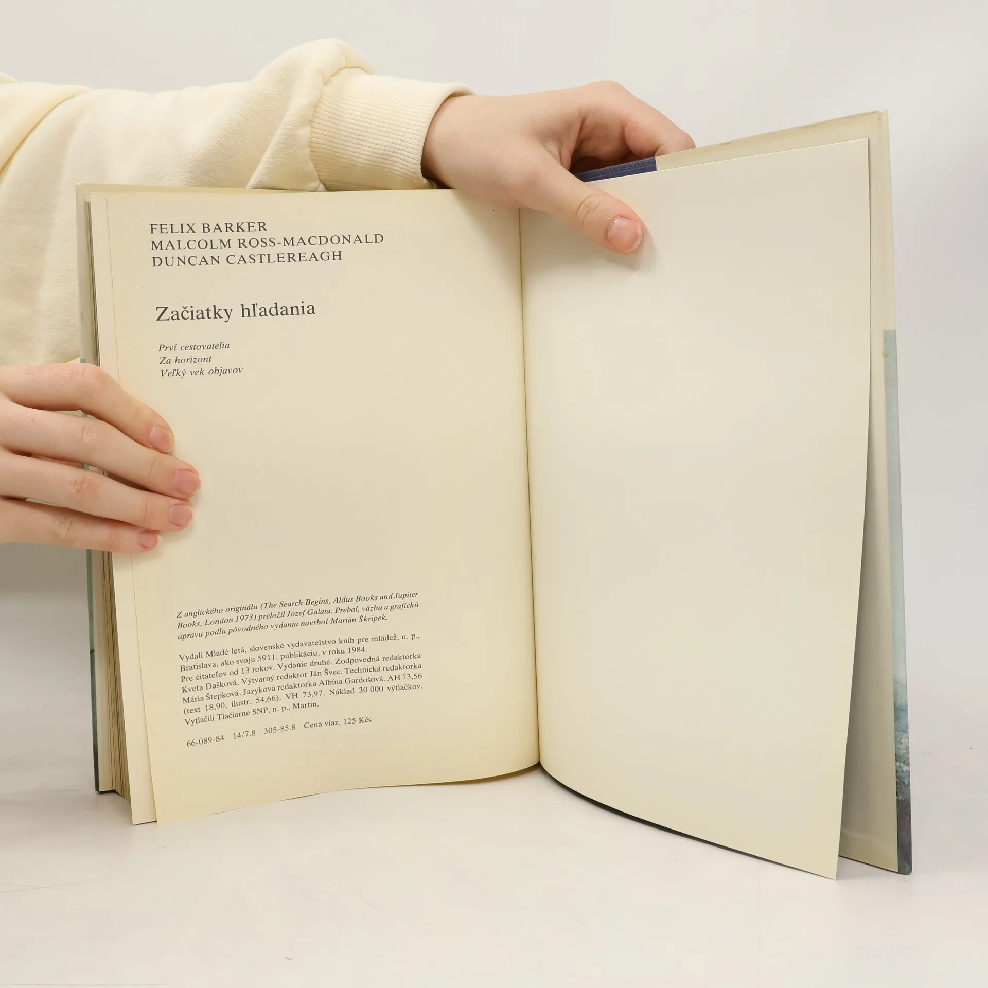 Dejiny zemepisných prieskumov a objavov. Kapitoly: Prvá časť-Prví cestovatelia-1. Do neznáma, 2. Cesty Egypťanov, 3. Priekopníci z Fenície, 4. Z Kartága na západ, 5. Grécki dobrodruhovia, 6. Alexander Veľký, 7. Nové horizonty, 8. Hannibal prekročil Alpy, 9. Objavy Rimanov, 10. Hodvábna cesta doČíny, 11. Koniec začiatku. Druhá časť-Za horizont-1.Veľký Atlantický oceán, 2. Nájazdy Vikingov, 3. Island a Grónsko, 4. Vikingovia v Severnej Amerike, 5. Džingischán a Mongoli, 6. Poslovia u veľkého chána, 7. Cesty Viliama Rubroeka, 8.Obchodné cesty, 9. Benátčania sa vracajú, 10. Marco Polo v Číne, 11. Cesty vedú do Číny. Tretia časť-Veľký vek objavov-1. Historická výzva, 2. Odpoveď, 3. More temnôt, 4. S nádejou na juh, 5. S Kolumbom na západ, 6. S Vascom da Gama na východ, 7. Ďalej na východ i na západ, 8. Okolo sveta.