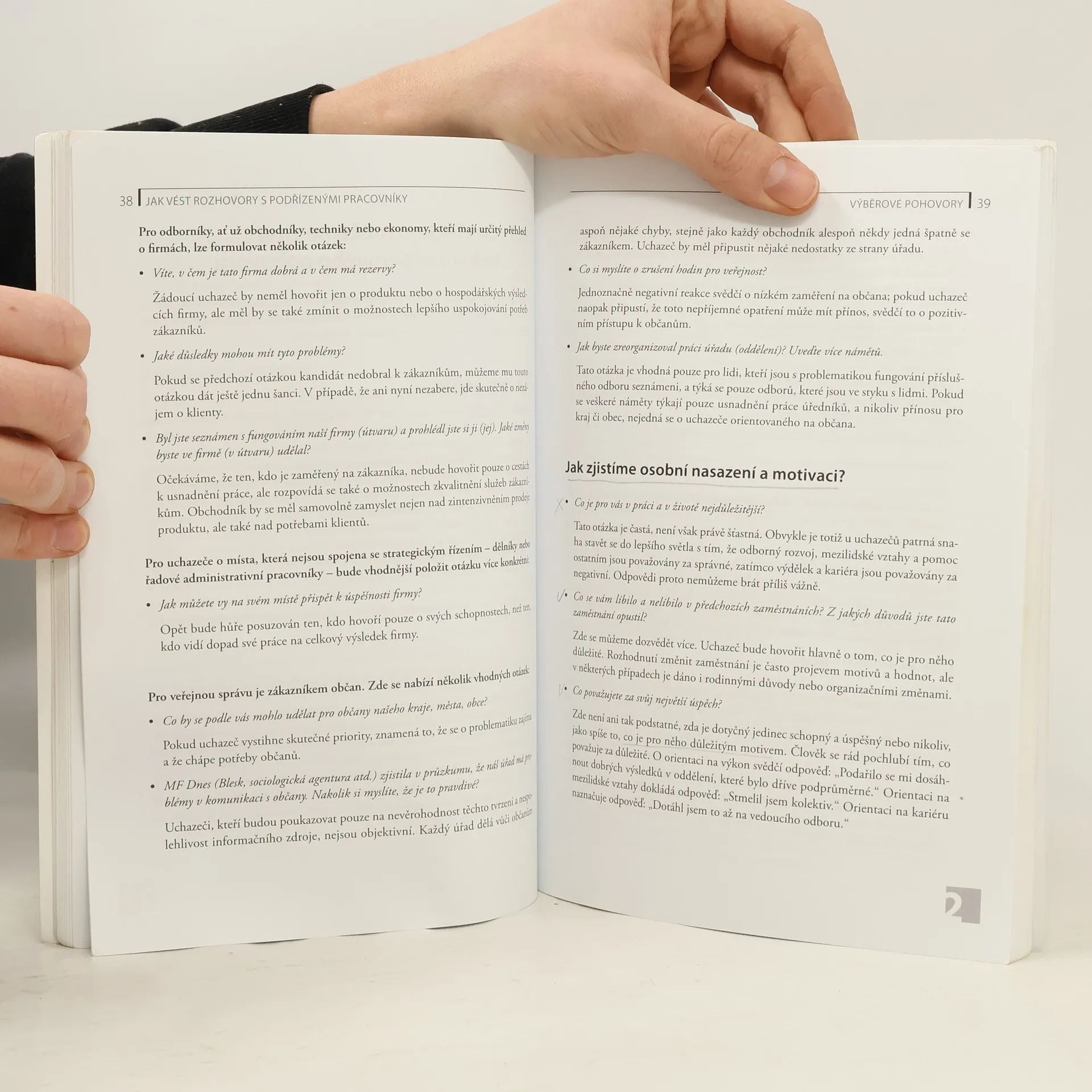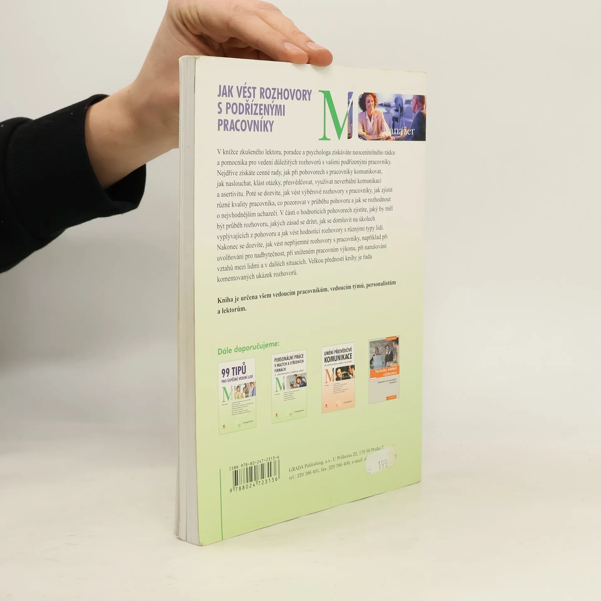 V knížce zkušeného lektora, poradce a psychologa získáváte neocenitelného rádce a pomocníka pro vedení důležitých rozhovorů s vašimi podřízenými pracovníky. Nejdříve získáte cenné rady, jak při pohovorech s pracovníky komunikovat, jak naslouchat, klást otázky, přesvědčovat, využívat neverbální komunikaci a asertivitu. Poté se dozvíte, jak vést výběrové rozhovory s pracovníky, jak zjistit různé kvality pracovníka, co pozorovat v průběhu pohovoru a jak se rozhodnout o nejvhodnějším uchazeči. V části o hodnotících pohovorech zjistíte, jaký by měl být průběh rozhovoru, jakých zásad se držet, jak se domluvit na úkolech vyplývajících z pohovoru a jak vést hodnotící rozhovory s různými typy lidí. Nakonec se dozvíte, jak vést nepříjemné rozhovory s pracovníky, například při uvolňování pro nadbytečnost, při sníženém pracovním výkonu, při narušování vztahů mezi lidmi a v dalších situacích. Velkou předností knihy je řada komentovaných ukázek rozhovorů. Kniha je určena všem vedoucím pracovníkům, vedoucím týmů, personalistům a lektorům.