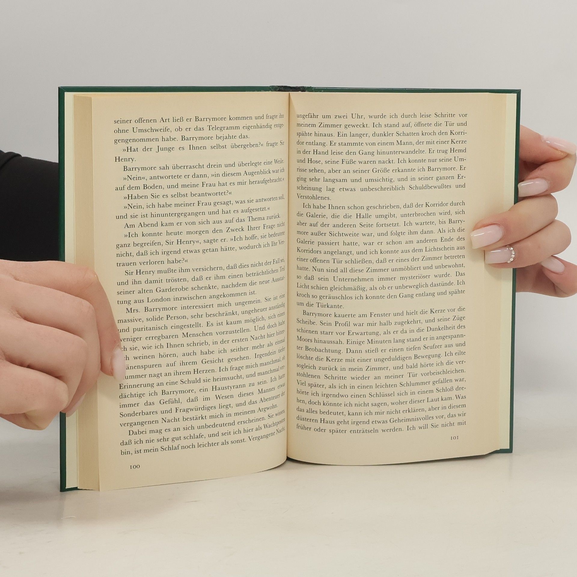 »Mr. Holmes, es waren die Fußspuren eines gigantischen Hundes!« Dr. James Mortimer senkt seine Stimme fast zu einem Flüstern, als er Holmes und Watson von dem plötzlichen und rätselhaften Tod Sir Charles Baskervilles von Baskerville Hall in Dartmoor, Devon, erzählt. Seine Leiche habe keinerlei Spuren von Gewaltanwendung erkennen lassen, aber sein Gesicht sei unglaublich verzerrt gewesen, so daß in der Gegend das Gerücht geht, er sei vor Schreck gestorben. Denn auf den Baskervilles lastet der Fluch des Hundes, einer schrecklichen geisterhaften Bestie, die im Jahre 1648 den ruchlosen Hugo Baskerville getötet hat und seither seine Nachkommen heimsucht und in ihr Verderben hetzt. »Ich habe bis jetzt meine Nachforschungen auf diese Welt beschränkt«, meint Holmes nachdenklich; doch bittet er Dr. Mortimer, den jungen Erben, Sir Henry Baserville, in die Baker Street 221 B zu bringen.