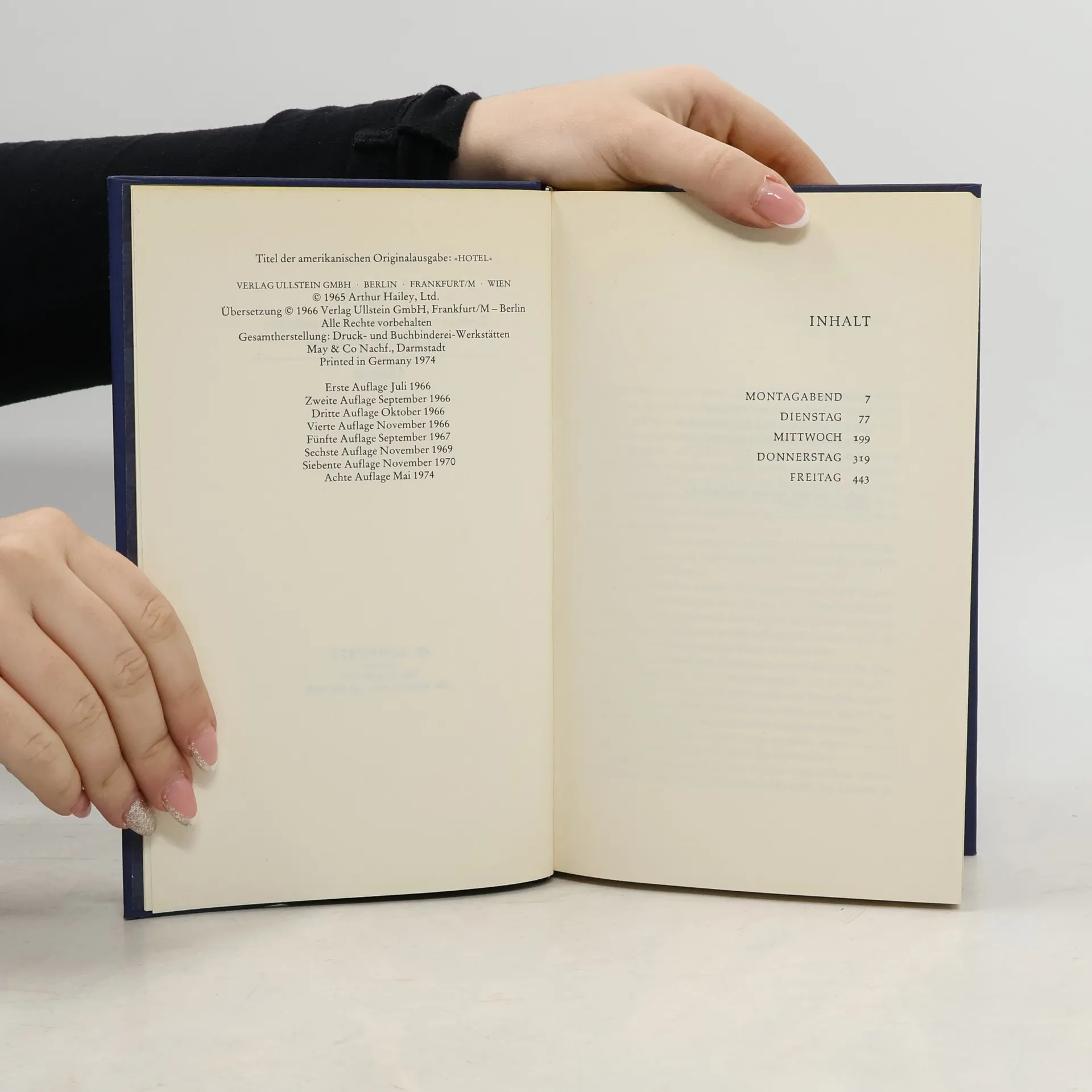 Es ist Montagabend. In dem luxuriösen St. Gregory Hotel in New York herrscht Hochbetrieb. Doch alles klappt wie am Schnürchen: beim Empfang, auf den Etagen, in den weitläufigen Restaurantionsräumen, in der Bar, in Küche und Keller. Man könnte zufrieden sein. Doch unter der gleißenden Oberfläche knistert es, denn das Hotel befindet sich in finanziellen Schwierigkeiten. Nicht nur der Hotelbesitzer Warren Trent ist davon betroffen. Auch seine Assistentin Christine Francis, der tüchtige Geschäftsführer Peter McDermott, der bestechliche Chefportier, der im Trüben fischende Hoteldetektiv und viele andere... Aber auch Gäste werden davon berührt. Das sind Curtis O'Keefe, Besitzer einer internationalen Kette von Hotels, der zu Kaufverhandlungen ins St. Gregory kommt, der dekadente Herzog von Croydon und seine eiskalte Gattin, der unscheinbare, zurückhaltende Albert Wells und zahlreiche andere, die mit dem Hotel durch unsichtbare und mitunter geheimnisvolle Fäden verbunden sind.