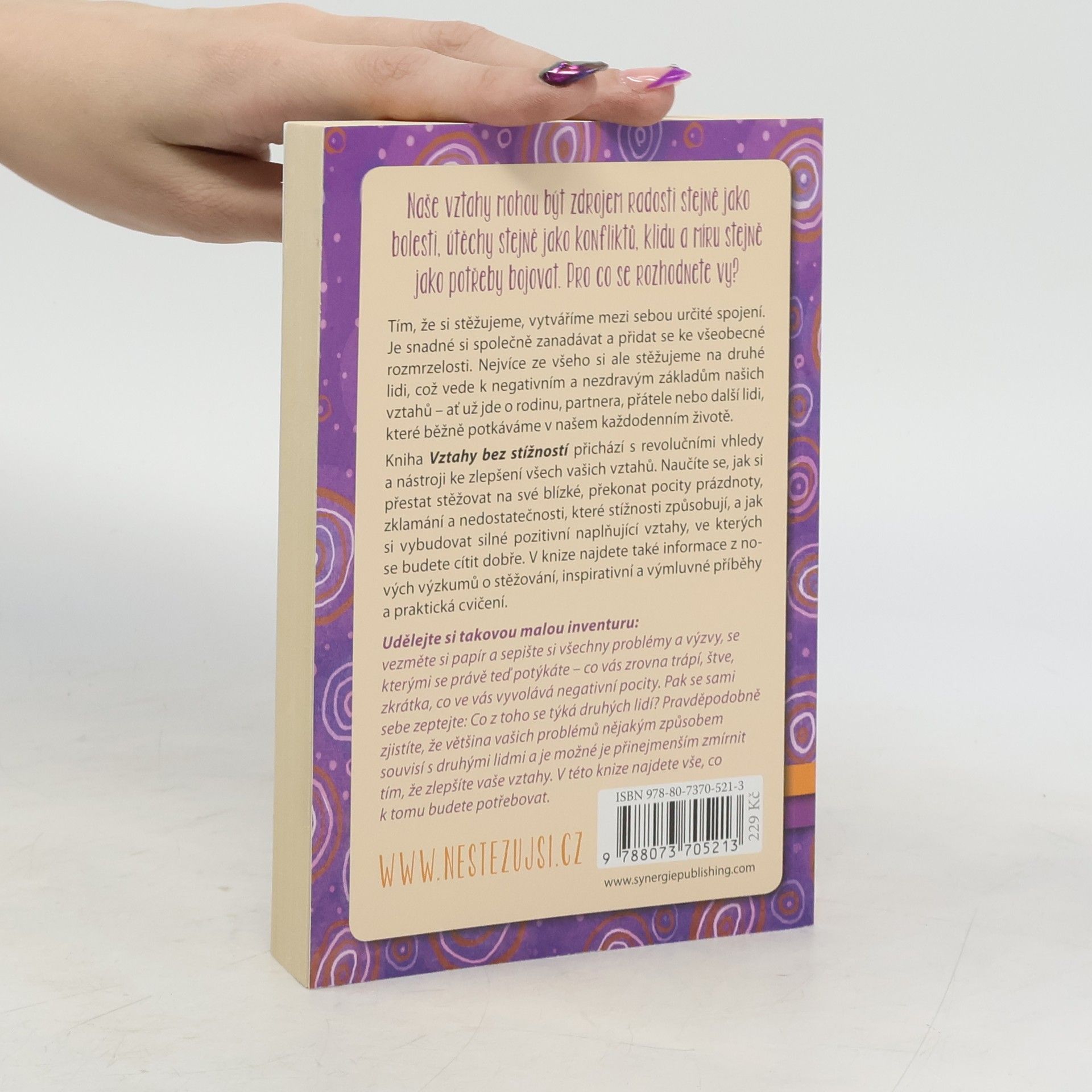 Tím, že si stěžujeme, vytváříme mezi sebou určité spojení. Je snadné si společně zanadávat a přidat se ke všeobecné rozmrzelosti. Nejvíce ze všeho si ale stěžujeme na druhé lidi, což vede k negativním a nezdravým základům našich vztahů – ať už jde o rodinu, partnera, přátele nebo další lidi, které běžné potkáváme v našem každodenním životě. Kniha Vztahy bez stížností přichází s revolučními vhledy a nástroji ke zlepšení všech vašich vztahů. Naučíte se, jak si přestat stěžovat na své blízké, překonat pocity prázdnoty, zklamání a nedostatečnosti, které stížnosti způsobují, a jak si vybudovat silné pozitivní naplňující vztahy, ve kterých se budete cítit dobře. V knize najdete také informace z nových výzkumů o stěžování, inspirativní a výmluvné příběhy a praktická cvičení. Více na http://nestezujsi.cz/ „Udělejte si takovou malou mentální inventuru: vezměte si papír a sepište si všechny problémy a výzvy, se kterými se právě teď potýkáte – co vás zrovna trápí, štve, zkrátka, co ve vás vyvolává negativní pocity. Pak se sami sebe zeptejte: Co z toho se týká druhých lidí? Pravděpodobně zjistíte, že většina vašich problémů nějakým způsobem souvisí s druhými lidmi a je možné je přinejmenším zmírnit tím, že zlepšíte vaše vztahy. V této knize najdete vše, co k tomu budete potřebovat.“