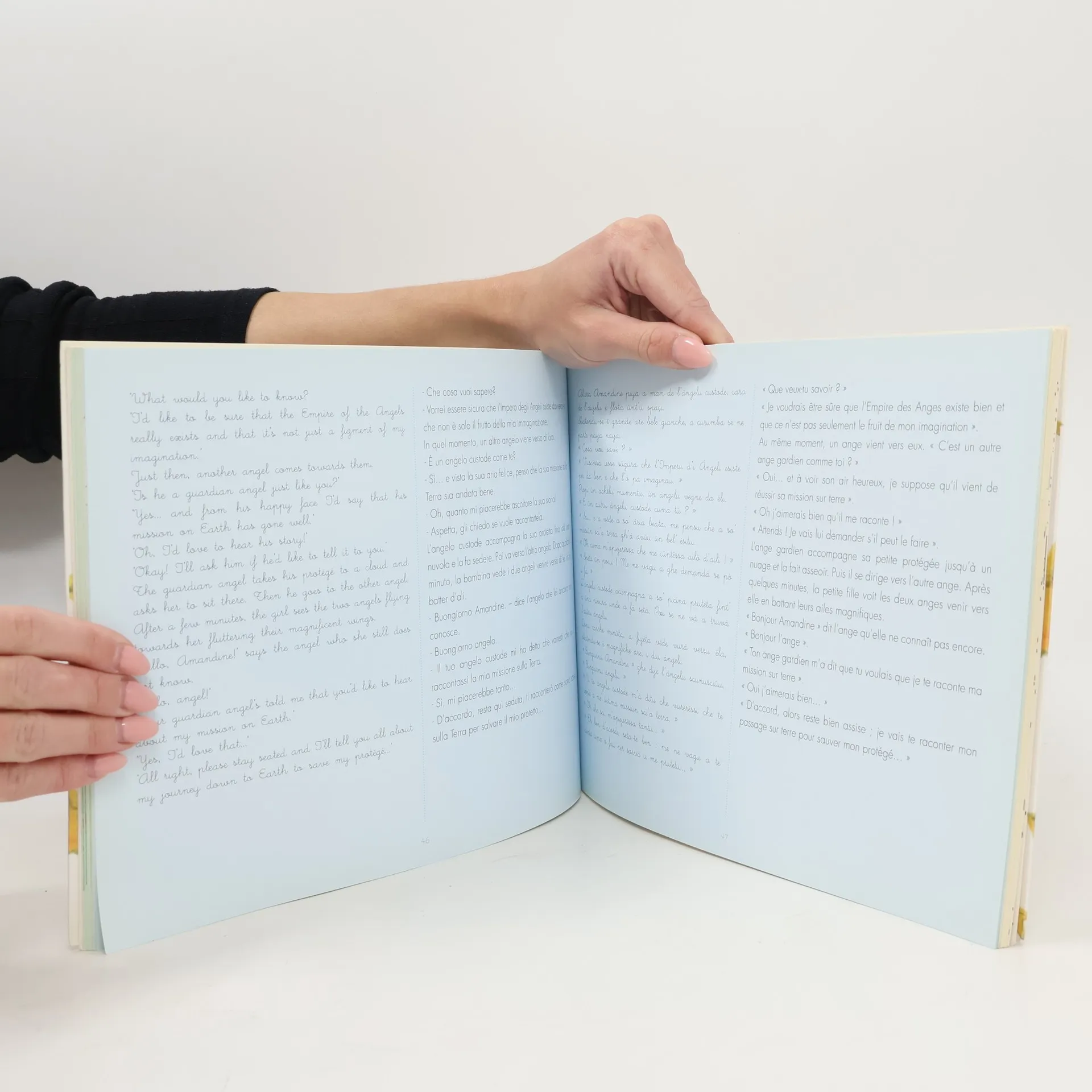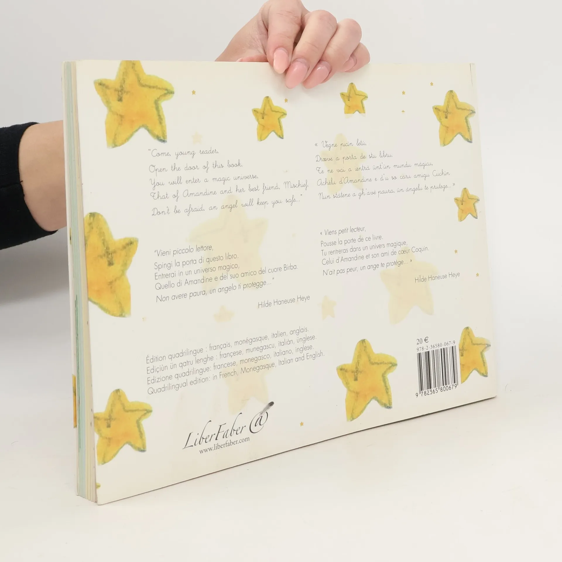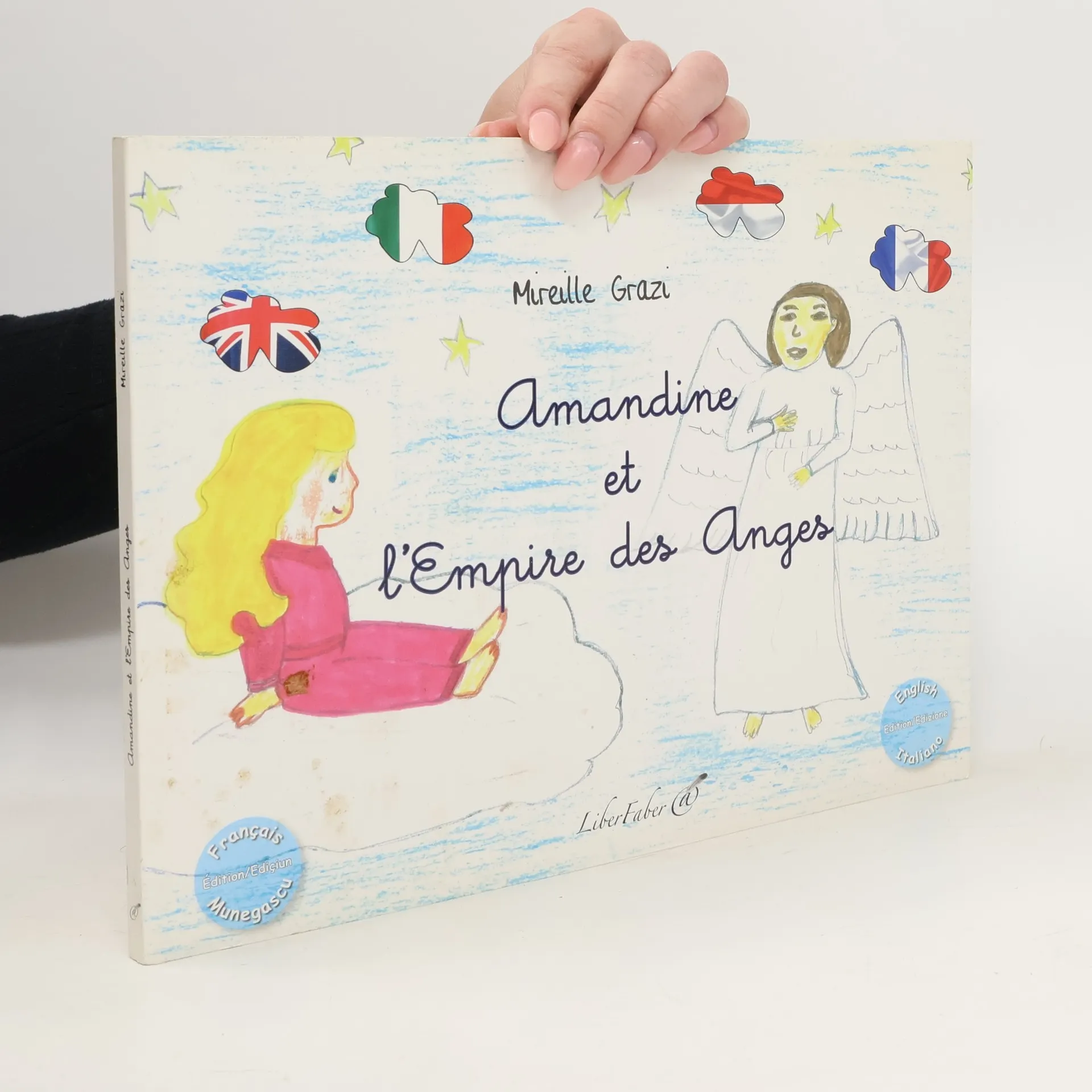 Amandine, petite fille de dix ans, se perd en forêt après avoir voulu rattraper son petit caniche. Elle se foule la cheville et attend ses parents, persuadée que ceux-ci se sont rendus compte de son absence et qu’ils se sont mis à sa recherche.Allongée au milieu des grands arbres, elle part à la découverte de l’Empire des Anges, dans lequel elle retournera par la suite pour vivre des histoires extraordinaires.Livre pédagogique quadrilingue : français, anglais, italien, monégasque.Livre illustré en couleur.Un cahier de coloriage complète le livre.